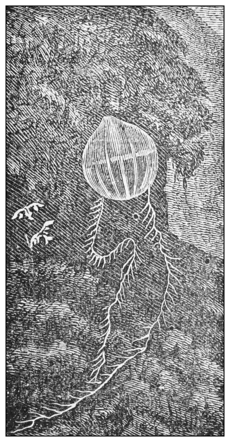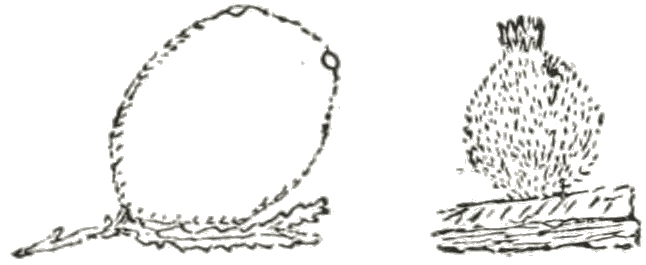 Everyone knows the thin flat transparent fronds of Sea Lettuce (Ulva latissima), which grows everywhere on the coasts, its margins crisped, folded, torn, or otherwise diversified by Nature, or the many things that feed upon it. It is[296] mentioned out of its place here, in order that we may bring into its proper order a plant that is frequently taken as a mere aberration of the Ulva. This weed is the Asperococcus turneri, a hollow green bladder on a short stalk, and rough with the spore-bearing organs. It is commonly found adhering to stones between tide-marks.