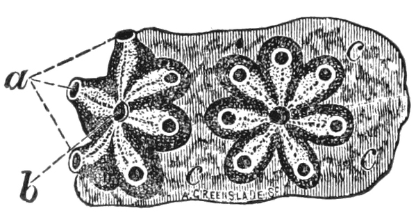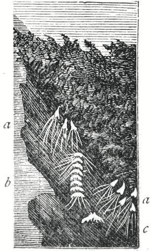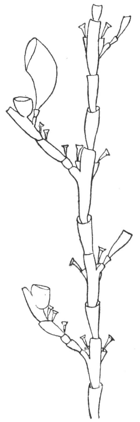 The Coralline (Corallina officinalis) grows in every pool, and its stony-coated joints are well-known, though it is a shock to some persons to find it classed among plants, when they had long imagined it to be related to the corals of which necklaces and islands are constructed. There are, in fact, several genera whose members secrete carbonate of lime, and so hide their vegetable character. The coralline was, however, once soft and flexible. Melobesia is equally stony, but grows in thin horizontal pink and purple plates or solid masses. A little weak muriatic acid will soon dissolve the lime, and reveal its true character. Jania somewhat resembles Corallina, but its branches are exceedingly slender, and much shorter than Corallina.