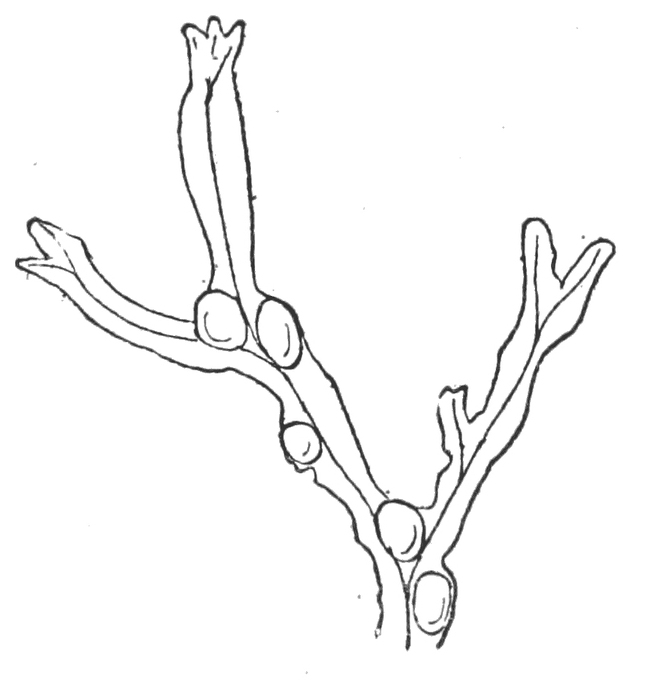 Another edible weed is the well-known Irish Moss or Carrageen (Chondrus crispus), which was in such favour years ago as an invalid’s food. It is well shown in the illustration, but is subject to great variation, especially as regards colour, ranging from greenish-white, and yellow, to a dull purple. In some of its forms it closely resembles Gigartina mamillosa, to which it is not very distantly related, and the danger of confusing the two is increased by Gigartina often growing amongst Chondrus. The tips of Gigartina’s frond, however, are usually broader than those of Chondrus, and the frond is rough, with little tubercles like[300] grape-stones (Greek, gigarton), which contain the spores. The usually purplish fronds will be found, on cutting them across, to be not solid, as they appear, but composed of delicate threads, in a firm clear jelly.