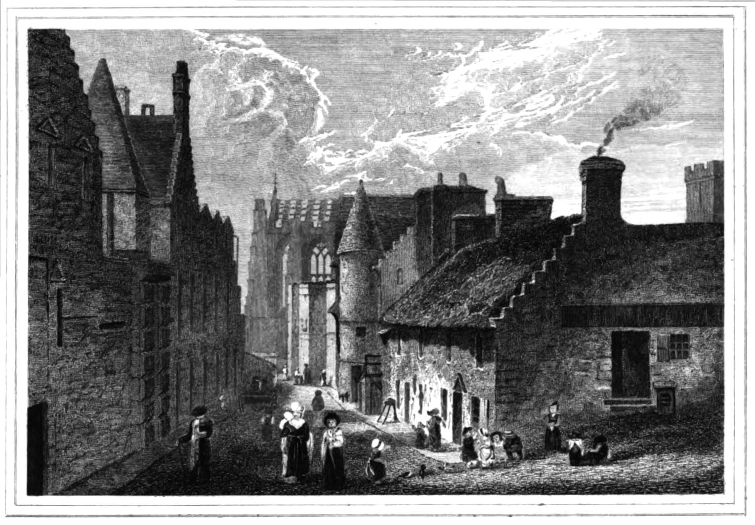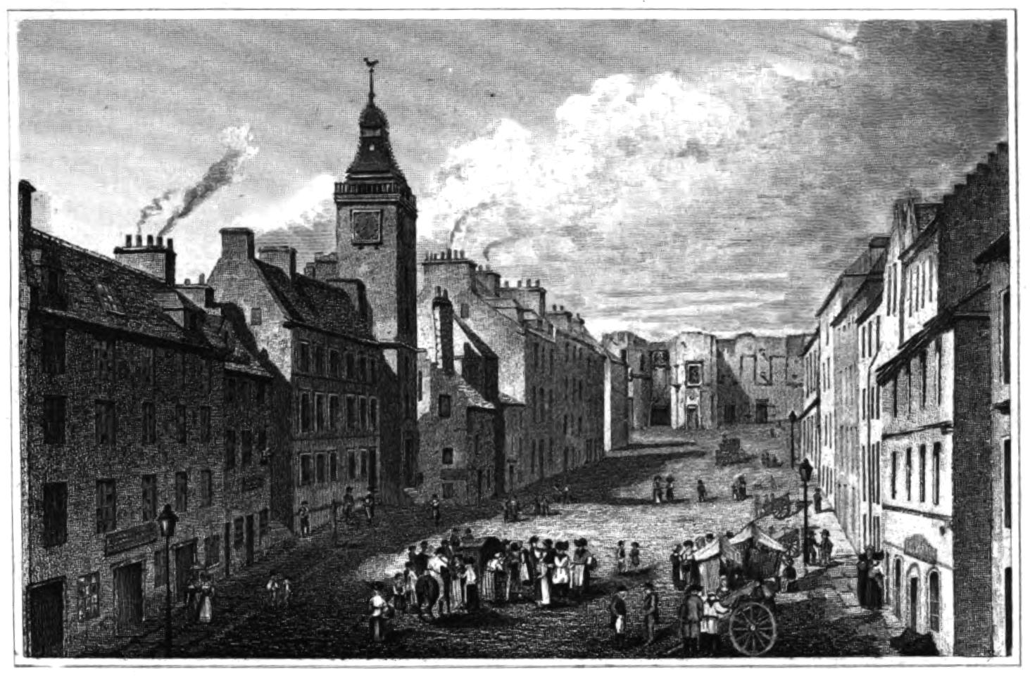 The High Street, or Broad Street, as it is now commonly called, is the principal street in Stirling. It lies, in the shape of a parallelogram, on the upper part of the hill whereon the town is built; and, what with the height of the houses, their substantial, and, in various instances, {32}antique architecture, the steeple of the town-house, and other favourable circumstances, it makes a very respectable appearance. The present draught represents it as seen from the bottom, looking upwards to the castle, the view at the top being closed by the ruins of the house of the regent Earl of Mar.