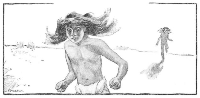 So he began to let go of the cliff, slowly, slowly—until he held it only with his finger-nails; and then he made a great jump away backward, and ran as hard as he could to a hill. But when he looked around and saw that the cliff did not fall, he was very angry, and swore to eat Too-wháy-shur-wée-deh the very minute he should catch him.