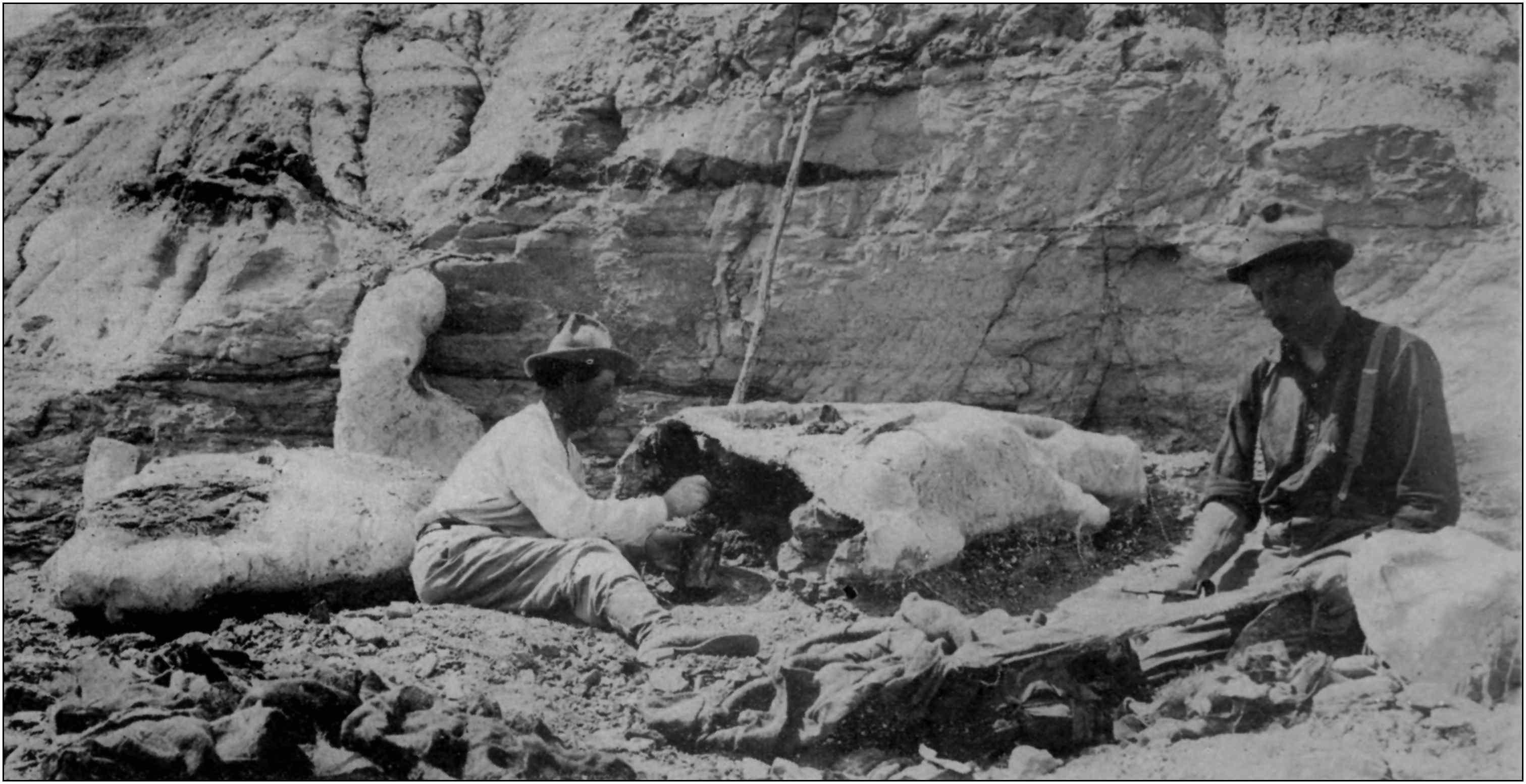 How can I thank the Director of the Geological Survey of Canada, and Deputy Minister, Mr. R. G. McConnell, who has allowed me to use the photographs taken by my sons George and Charlie, to illustrate my pages. The text would have been dull indeed without them. Neither can I express my thanks for his unfailing kindness to me while I was under his authority as a member of the Survey. All the photographs (except the Front Piece Figures 1, 2, and 3, which[viii] were sent to me by my old friend, Dr. Osborn, President of the American Museum of Natural History, New York. The picture of a Portheus, from the London Illustrated News, the Figure of a Tylosaur by my son George F. Sternberg. The restoration of Diplodocus carnegii by Mr. C. W. Gilmore of the U. S. National Museum, and the figures 43, 44, and 45 taken last year by my son Levi) belong to the Survey. Mr. Clark in charge of the Division of Photography developed the photographs, and the Terre Haute Engraving Co. made the halftones. Neither can I forget the unvarying kindness of the former Deputy Minister, Dr. R. W. Brock who first employed me. For the great assistance he rendered me in field and shop. For his earnest assistance to help me build up a great collection of the Extinct Animals of Canada, at the Victoria Memorial Museum at Ottawa, Ontario. I hope these gentlemen and all others who have helped me to that end, will feel themselves included in this letter of thanks.