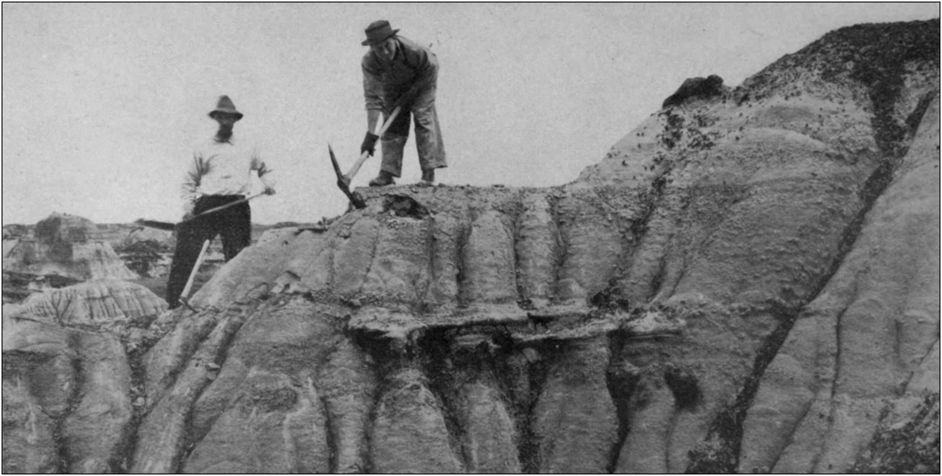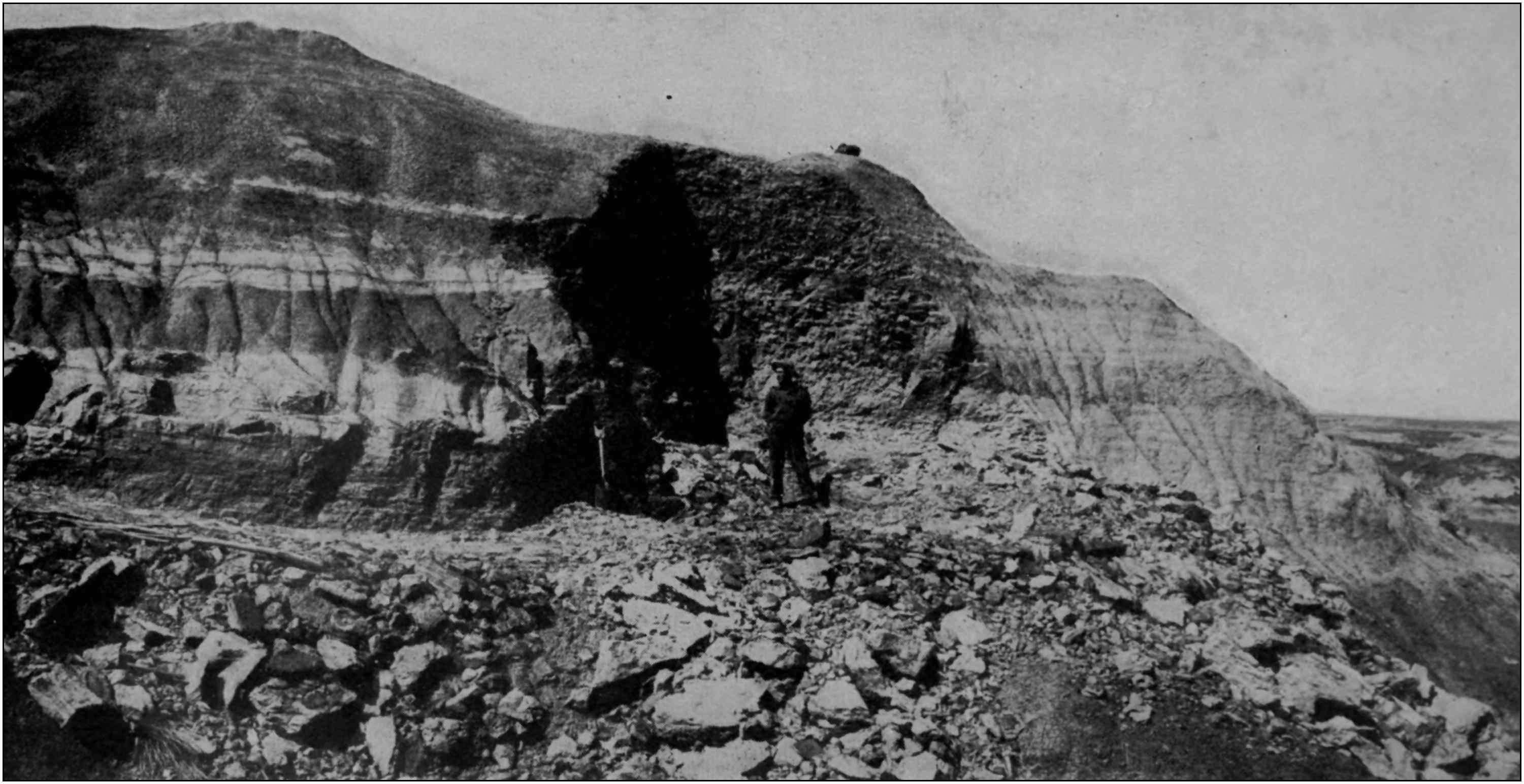 Two seasons my sons and I collected in the Kansas Chalk, the Lance Beds of the old Converse County that is now named Niobrara County, Wyoming, and in the Oligocene, of the same County. Strange to say, however, five years have been spent in the Dominion of Canada, where, with the assistance of my three sons, I helped[2] build up a great collection of the Dinosaurs of the Red Deer River, Alberta, under the direction of the Geological Survey of Canada. The present year of 1916, with the help of my youngest son Levi, I have been engaged in the same service for the British Museum of Natural History. As my readers will bear witness, in the past, I have seen my choicest treasures for forty years leave my hands forever, to add to the glories of museums I shall in all probability never see. When the opportunity came, however, so suddenly and unexpectedly—the opportunity of a life time—to crown my last days with a monument that only time’s ravages or the vandal hand of man can efface, in that growing Dominion of the North that promises to be one of the great countries in the boundless Western Hemisphere, it seemed to me like a call from heaven. Though the ties of a lifetime, nearly, that bound me to many a dear friend at Lawrence, Kansas, must be severed. Though I must leave the protecting folds of my father’s flag and mine, and I must live under a flag that has waved a thousand years—under a Monarch, in fact—I, a republican of republicans! Think of it! After three years residence in the beautiful city of Ottawa, the capital of all the broad expanse North of the international line, after four seasons of work among buried dinosaurs and three winters spent in the laboratory of the Victoria Memorial Museum of Ottawa, I am free to confess I would not have known so far[3] as personal liberty is concerned that I was all this time in the employ of his Royal Majesty George the Fifth of England and ruler of the British Empire. I have learned, I believe, that a man is as much a man amidst the snows of the Lady of the North, under the Union Jack, as under my own beloved Stars and Stripes. Our hopes, our ideals, our aims are much the same.