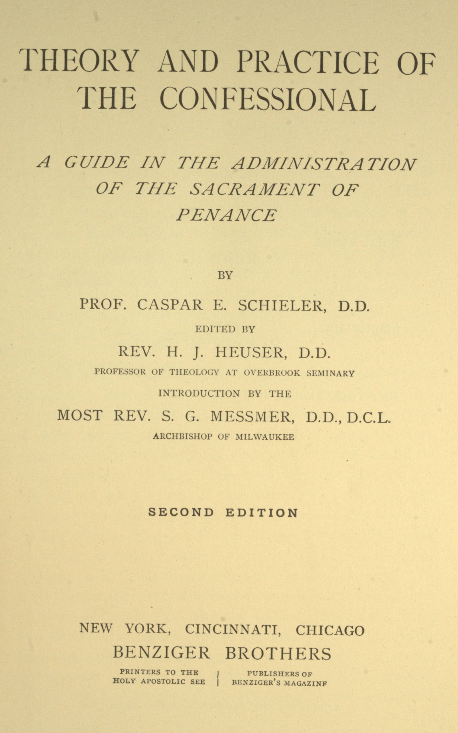 An English translation of Dr. Schieler’s exhaustive work on “The Sacrament of Penance,” for the use of theological students and missionary priests, had been advised by some of our bishops and professors of theology. It was felt that, under present conditions, a work in the vernacular on a subject which involved to a very large extent the practical direction of souls was an actual necessity for many to whom the Latin texts dealing with the important questions of the Confessional were for one reason or another insufficient.