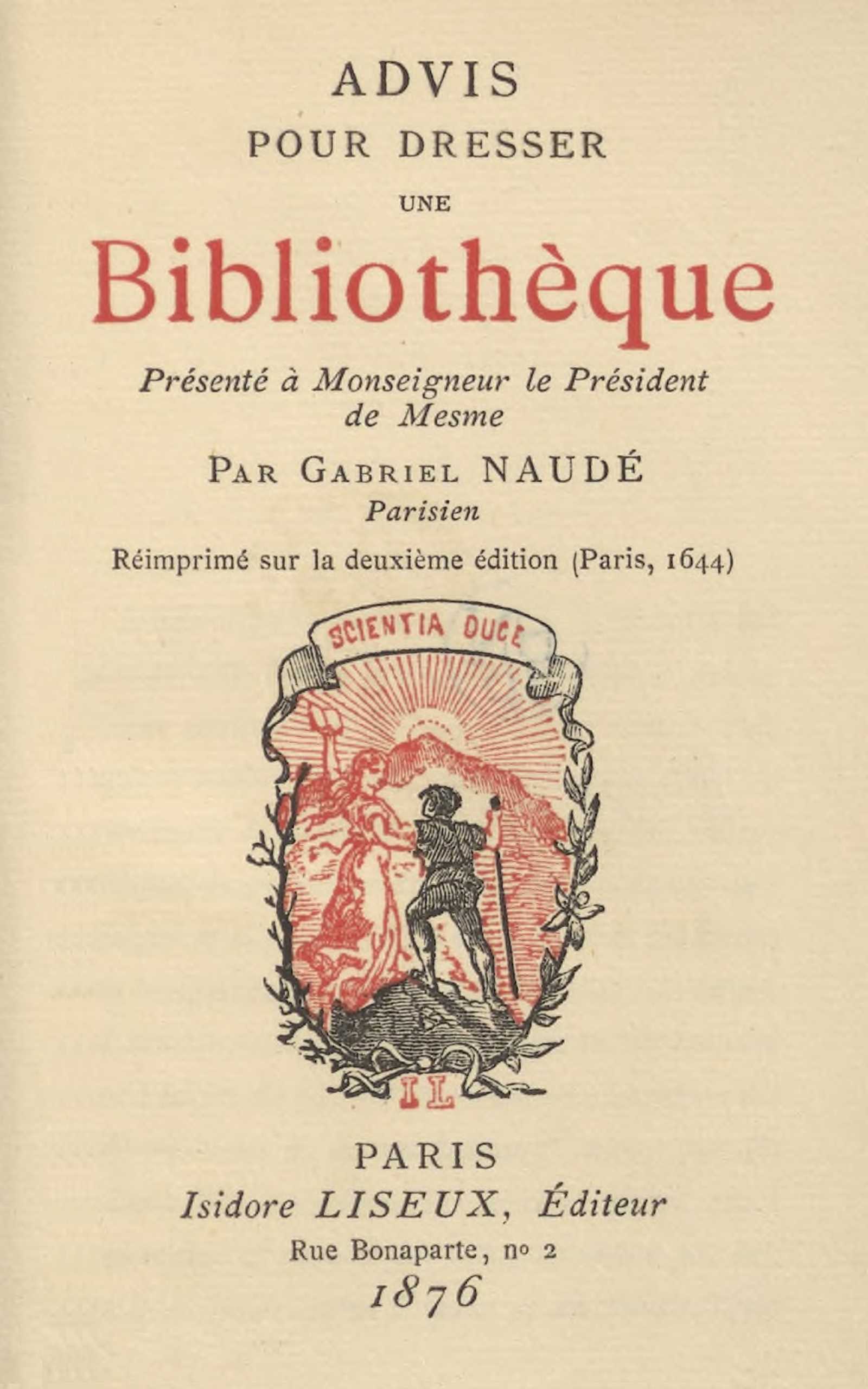 L’Advis pour dresser une bibliothèque est un de ces livres d’érudition aimable qui se lisent toujours avec plaisir. Nul n’était plus apte à traiter ce sujet que Gabriel Naudé, le passionné bibliophile, l’organisateur des bibliothèques du président de Mesmes, des cardinaux Bagni et Barberini (deux des grands amateurs du temps), de Mazarin et de la reine Christine. Il semble même qu’il n’aurait pu écrire ce livre qu’à la fin de sa carrière, comme résumé de ses observations et de ses travaux, alors que les plus belles collections lui avaient passé entre les mains et avaient été mises en ordre par lui, tant en Italie qu’en France et en Suède. C’est au contraire au début de sa vie, à l’âge de vingt-cinq ou vingt-six ans, simple étudiant en médecine, recueilli par le président de Mesmes pour mettre un peu d’ordre dans ses livres, qu’il fit preuve en rédigeant cet opuscule, d’un savoir véritablement étonnant, de connaissances déjà si étendues et si variées, et surtout de ce remarquable esprit de classification dont il était doué. Depuis, il suivit toujours la même voie, sans s’en laisser détourner même par ses vastes travaux d’érudition et par les vives polémiques auxquelles il fut contraint de se livrer pour les soutenir. Il passa sa vie dans les livres, classant ceux qu’il avait, guettant ceux qu’il n’avait pas juste au moment où les collections auxquelles ils appartenaient pouvaient tomber en son pouvoir, achetant sans cesse, en France, en Hollande, en Italie, en Angleterre, presque toujours pour le compte des autres, parfois aussi pour son propre compte quand les malheurs des temps faisaient chanceler la fortune de ses protecteurs. On le vit bien pendant la Fronde lorsqu’un arrêt inepte du Parlement ordonna la vente de la bibliothèque du cardinal Mazarin dans laquelle Naudé, au prix de tant de peines et de fatigues, avait réuni près de 40,000 volumes. Ce fut un véritable pillage dont Naudé sauva ce qu’il put, en y consacrant tout l’argent qu’il avait, une maigre somme, un peu plus de 3,000 livres.