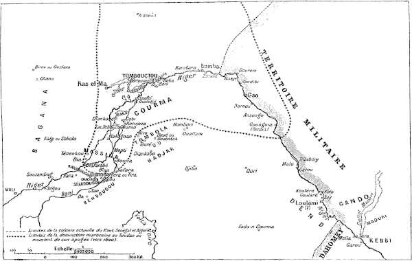 En mars 1896, des Hoggar venus du Sahara central razzièrent des troupeaux appartenant à nos alliés les Bérabich, au Nord-Est de Tombouctou ; ils furent surpris à Akenken et mis en déroute par le capitaine Laperrine. Du côté de l’Ouest, au contraire, la situation s’améliorait sensiblement : nous occupions Ras-el-Ma en mai 1896, puis Néré, et le colonel de Trentinian, s’étant transporté à Goundam, y recevait la soumission définitive[423] de Sobo, chef des Tenguéréguif ; en janvier 1897, le lieutenant Wirth pacifiait les pays situés entre Niafounké et Goumbou et occupait temporairement Bassikounou.