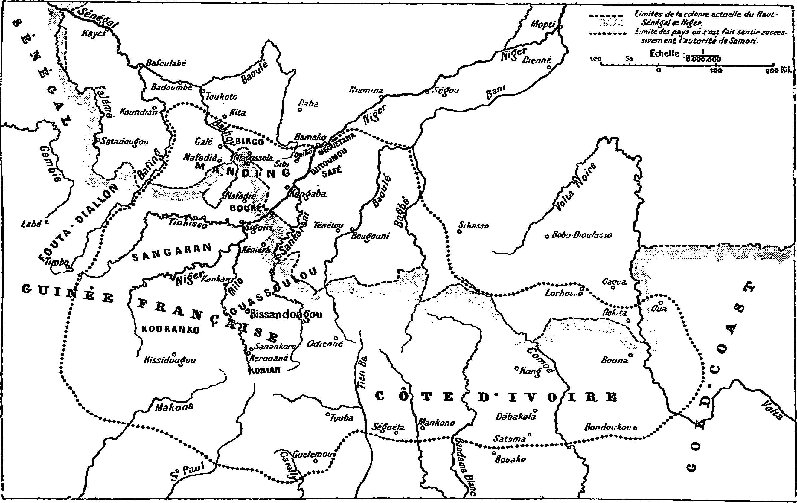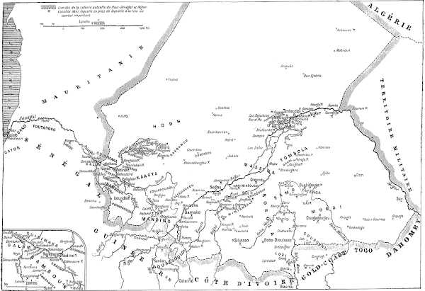 Le 1er mai 1898, le colonel Audéoud s’emparait de Sikasso sur Babemba, dans les circonstances que j’ai relatées plus haut (chapitre XIII) et, le 29 septembre de la même année, le sergent Bratières, qui faisait partie du détachement des capitaines Gouraud et Gaden, faisait prisonnier Samori près du haut Cavally : les deux principaux adversaires de notre expansion vers le Sud avaient disparu. D’autre part, des conventions passées avec l’Allemagne en 1897 et avec l’Angleterre en 1898[422] limitaient vers le Nord les zones d’extension du Togo et de la Gold-Coast.