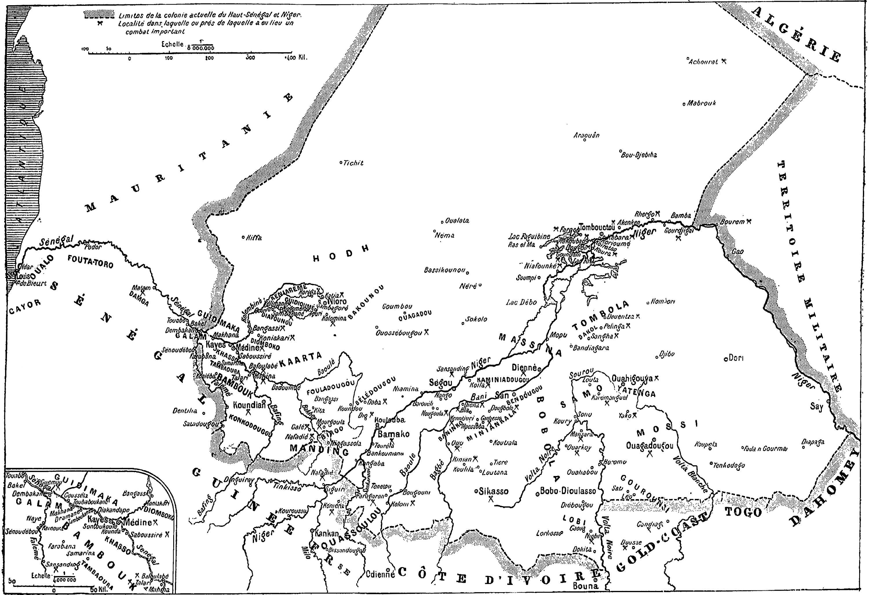 Durant cette dernière année, le capitaine Destenave, alors résident à Bandiagara, conclut un traité à Ouahigouya avec Bagaré, qui venait d’être proclamé empereur du Yatenga ; il chercha vainement à entrer à Ouagadougou, puis, par une série d’heureuses randonnées, obtint la soumission des Samo et des Bobo du Nord, étendant notre autorité dans la vallée de la Volta jusqu’à Ouarkoy et dans l’Est de la Boucle du Niger jusqu’à Dori. Il fut obligé aussi d’intervenir dans les affaires intérieures du Massina, où Aguibou ne pouvait arriver à se faire obéir des Peuls ni des Tombo. En 1896, les Tombo du Dakol et les Peuls de la même région se soulèvent à la voix du marabout Hamidou-Kolâdo, qui est battu à Sangha et tué peu après par un spahi auxiliaire, au moment où il cherchait à s’enfuir dans la montagne[376].