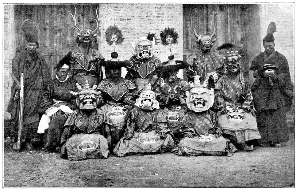 TIBETAN LAMAS MASKED FOR A RELIGIOUS DANCE.