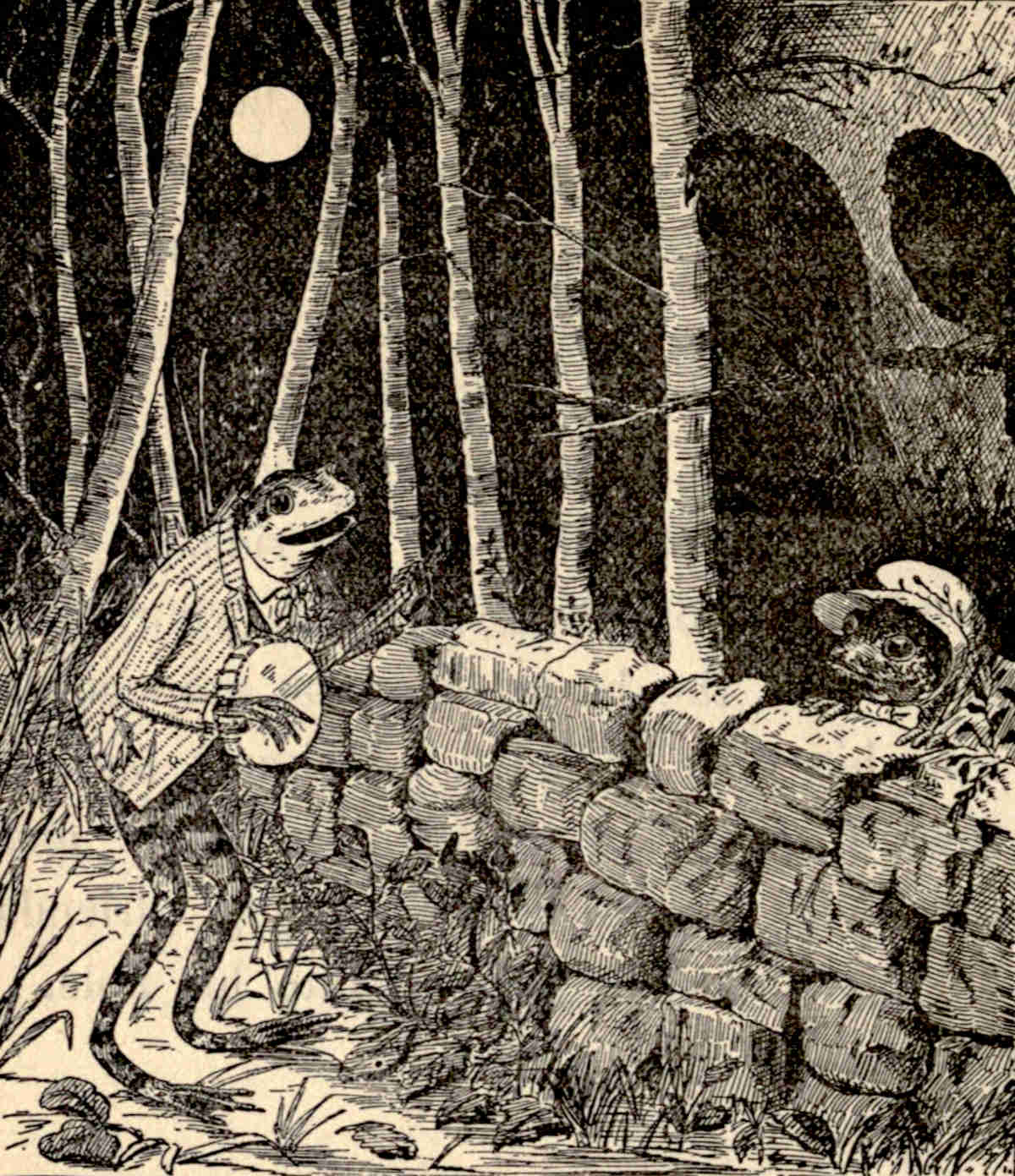 One moonlight night, the owl repaired to a large oak-tree on the edge of the wood; and about him assembled the crow and the water-rat, with various friends whom they [Pg 9]had brought as witnesses, besides many other interested parties.