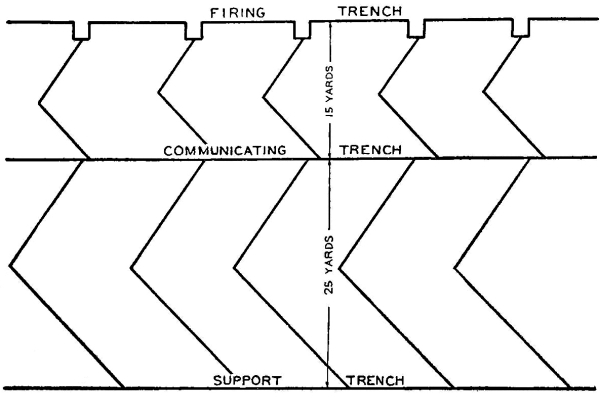 The contracted camping spaces afford sufficient room for a one-night halt. They require that the animals and vehicles of a single troop, battery, or company be placed on the same line with the men where practicable to do so within the camp lengths above given; that the men be in double shelter tents (or in double row of shelter tents), and that the lines on which adjacent companies are established be separated by distances not exceeding 11 yards for infantry and other dismounted organizations, double carriage length for field artillery (except mountain), and 12 yards for cavalry and remaining mounted organizations. Latrines are placed on the opposite side of camp from company kitchens and at a minimum distance of 50 yards from the men.