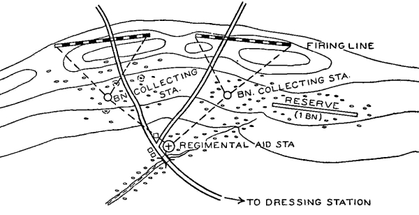 [8] Calculated for a supply train consisting of 3 sections, each containing one day’s supply of rations and forage (grain only), and an ammunition train of 6 wagon companies, 4 of small arms and 2 of artillery ammunition. This is the tentative organization of 1914, but the method indicated may be applied to any given organization of the trains.