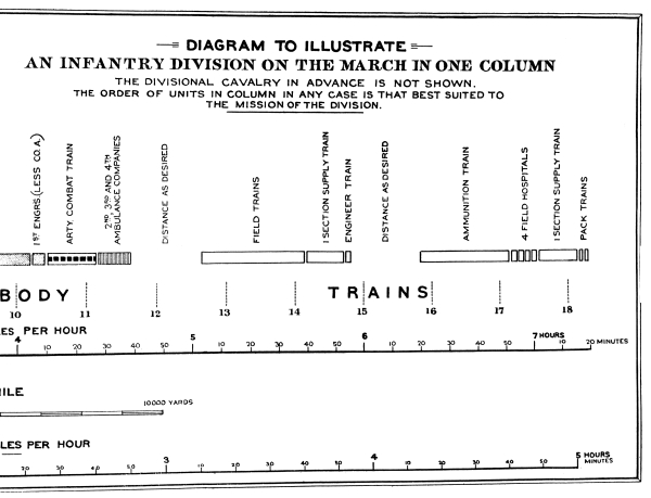 [2] This table is based upon the road spaces occupied by troops at war strength, infantry in column of squads, cavalry in column of fours, artillery and trains in single column.
