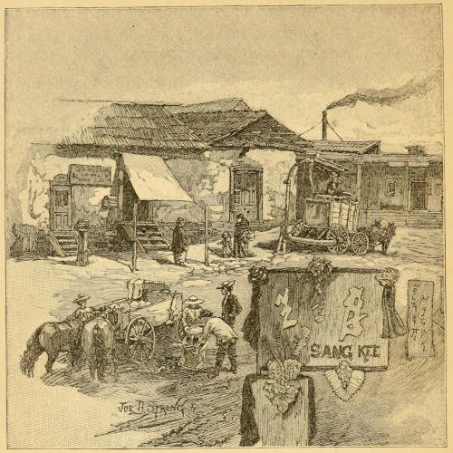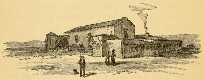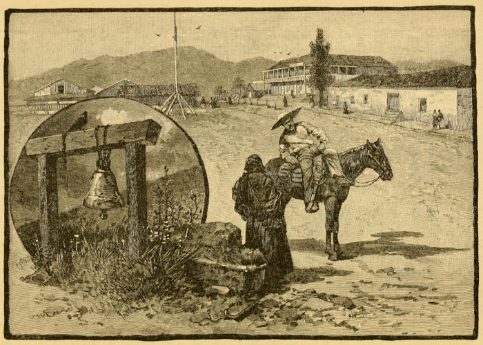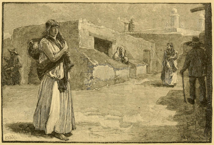 Tucson, from a distance, in early morning or late afternoon, is level, low, square, and brown, with a mellow light upon it and the castellated mountains behind it. In the foreground you see lazy ox-wains, a prospector, perhaps, with his pots and kettles, and a mounted Mexican towing by a lariat a bull, which ducks its head in vain resistance. From a distance it is thoroughly foreign, and of attractive promise. There is something of the Dead Sea apple in the realization of this promise. If Ruskin be right in holding that a house should be of the general color of the soil on which it stands, Tucson may lay claim to great artistic merit. It is entirely of adobe brick of the natural mud-color. Violent rainstorms occur, to the detriment of paint and kalsomine, on such a friable surface, and their use becomes a serious question of economy.