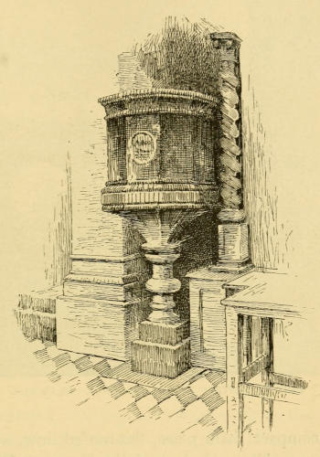 The designer, whoever he may have been, was inspired by Venetian-Byzantine traditions. It is roofed with numerous simple domes and half-domes. The interior of these, frescoed with angels and evangelists, the chancel walls, almost covered with gilding, but stained and battered, and the painted and gilded lions on the chancel rails, recall to the least observant Saint Mark’s at Venice. The style is not quite consistently carried out, however. A later rococo decoration, as exuberant as the vagaries of East Indian work, mingles with and at places overrides it. A Henri II. candlestick will give a certain idea of the pattern of the columns.