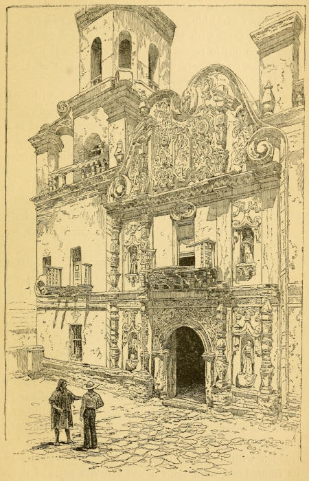 San Xavier is on the reservation of the Christianized Papago Indians, in the Santa Cruz Valley, ten miles to the southward. It is a new sensation even for one from Mexico who may have flattered himself that he knew the style completely. This ancient landmark of a frontier civilization which, since its destruction, has not been even faintly approached in its kind, is not surpassed either in Mexico or out of it for the quaintness, the qualities of form and color, and the gentle sentiment of melancholy that appeal to the artistic sense. Old Father Time has trodden with heavy step on green wooden balconies in its front, broken out their floors, and left parts of them dangling free. The original sweet-toned bronze bells still hang in one of the towers. The space, terminating in a scrolled gable, between the towers is enriched with escutcheons and rampant lions, wreathed in foliage. Niches hold grotesque broken statues, and complicated pilasters flank the entrance door-way, the whole formed in stucco upon a basis of moulded bricks. Where a portion has fallen away it can be seen that the pilasters are constructed upon or held together by a centre consisting of a stick of timber.