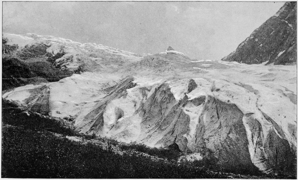 The Glacier Hotel will always remain a popular point, because it is so near a great glacier of almost Alaskan dimensions. It is only about a mile thence to the foot of the glacier, which has the moraine of huge boulders, the gaping crevasses, the stream at the end, and all the other accessories of ice-rivers. At noon, on a warm day, when the ice melts rapidly, the roar of the glacial stream can be distinctly heard far away; but as the sun sinks lower, the water flows more scantily, and at night the brook is silent or merely whispers.