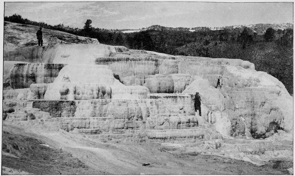 After a dusty stage ride, lasting several hours, and very much uphill, the passengers are landed at the Mammoth Springs Hotel, where a fair supper and good beds await them. Although this hotel is conveniently located near the foot of the remarkable many-storied, snow-white terrace-mound, built by the calcareous deposits of the hot springs, and adorned with the most brilliant colors, its site is nevertheless badly chosen; for there is no view from either the front or back windows, or from the piazza; whereas, if the building had been erected only a few hundred yards to the front, visitors might have enjoyed an extensive and delightful mountain view on all sides. This error is possibly responsible, to a large extent, for the fact that fewer visitors than had been expected make this large hotel their home for a week or two. With the exception of that at the Upper Geyser Basin, all the Yellowstone Park hotels are placed in like manner, though in each case a picturesque situation might have been found within a short distance. Perhaps the builders calculated that visitors, after their wearisome stage ride of forty or fifty miles and a subsequent brief inspection of the geysers, would hardly look upon the hotels as anything [282]else than a place for providing them with meals and beds.