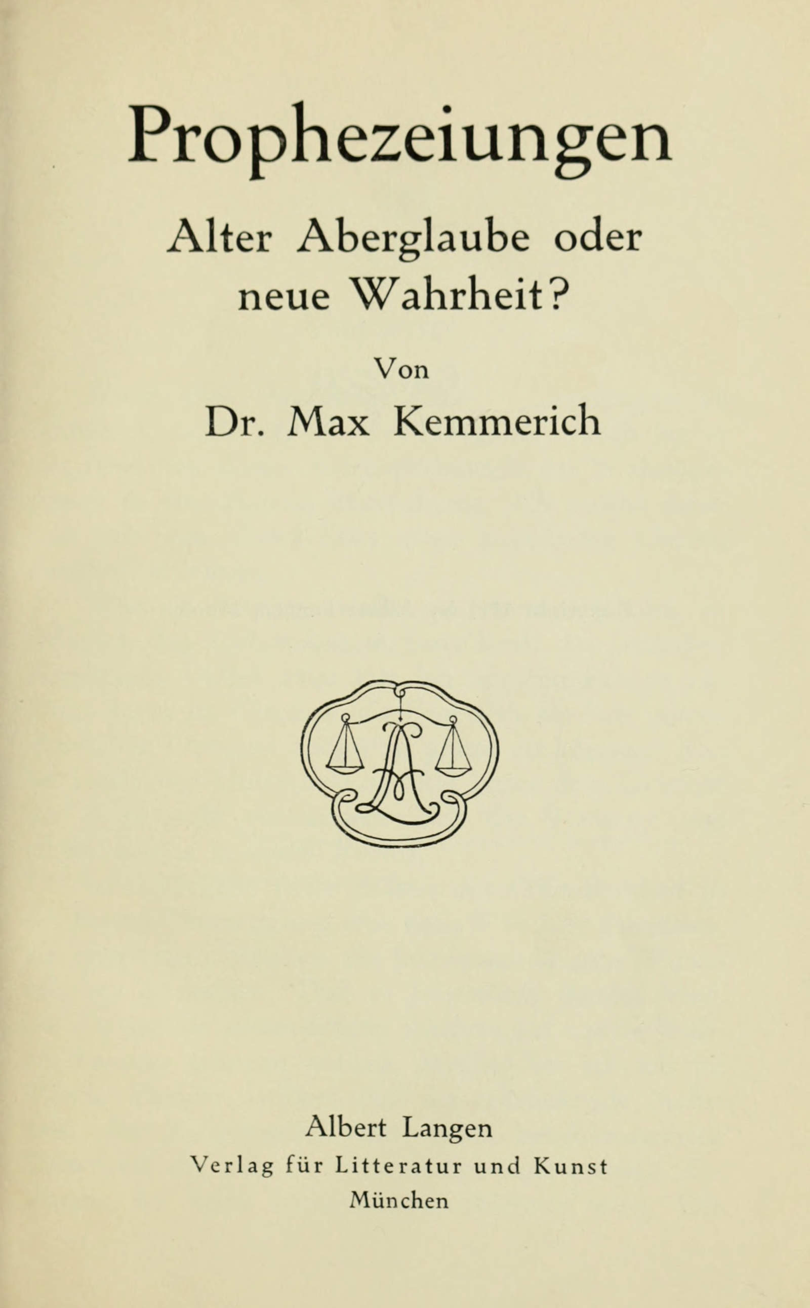 Ich selbst besitze die Gabe der Prophetie nicht. Ich bin auch weder Spiritist noch Okkultist. Nicht etwa deshalb, weil ich die von jener Seite behaupteten Erscheinungen für unmöglich hielte, sondern lediglich [S. 14]deshalb, weil ich noch keine Gelegenheit hatte und sie wohl auch nicht suchte, mich von ihrer Richtigkeit zu überzeugen. Ich bin lediglich als Historiker an diese Frage herangetreten, und zwar kam das so: