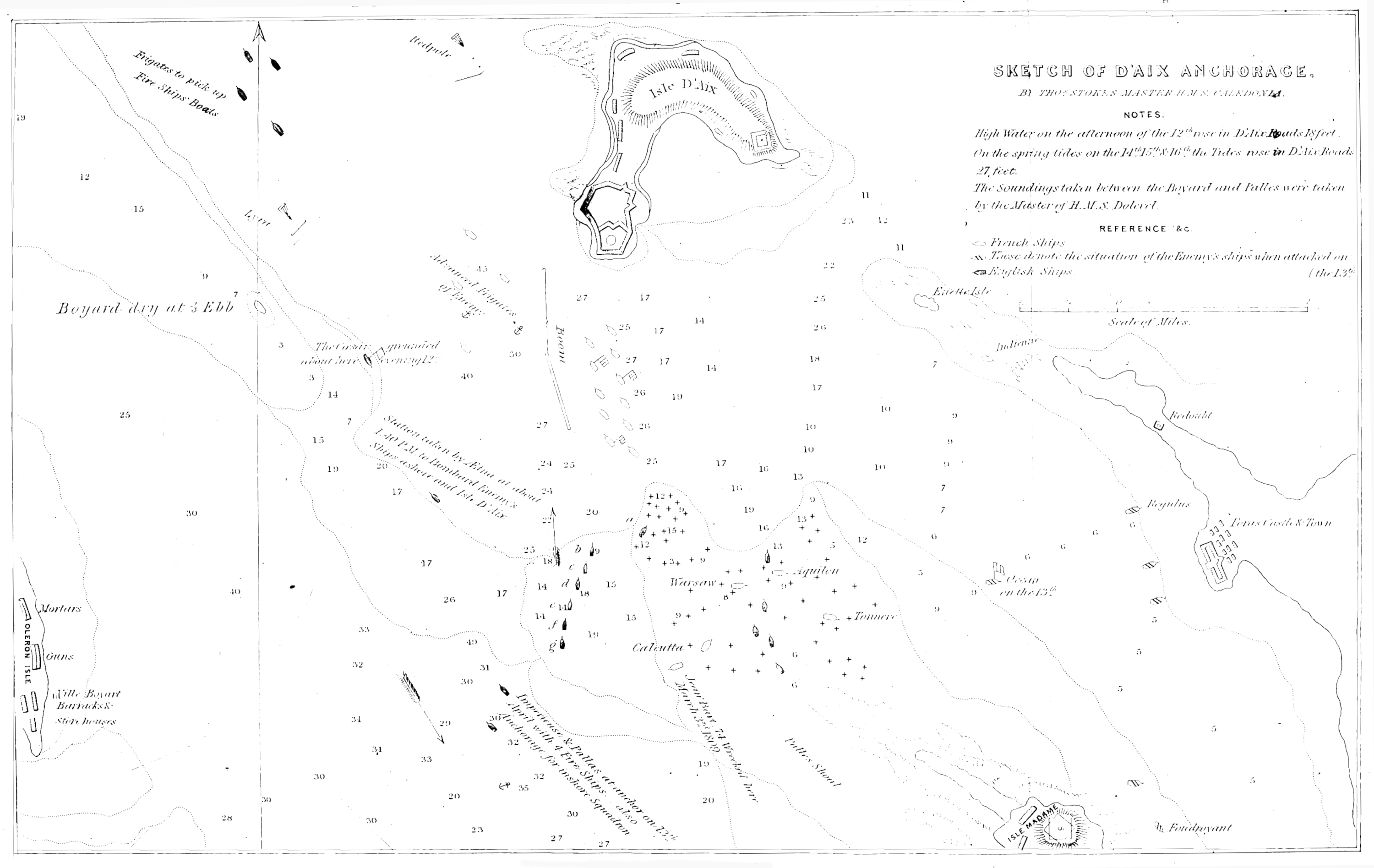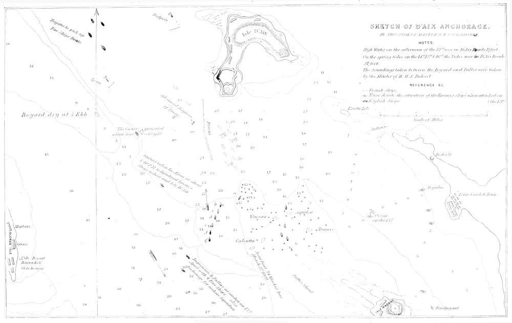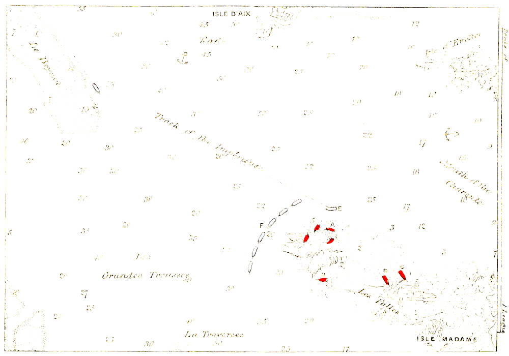 The Evidence of Officers present in Basque Roads.—Admiral Austen’s Opinions confirmatory of my Statements.—Fallacy of alleged Rewards to myself, in place of these Persecutions.—Treatment of my eldest Son, Lord Cochrane.—Letter from Capt. Hutchinson confirmatory of the Enemy’s Panic.—A Midshipman near taking the Flag-ship.—Evidence of Capt. Seymour, conclusive as to Neglect, which was the Matter to be inquired into, in not sending Ships to attack.—Attempt to Weather his Evidence.—Capt. Malcolm’s Evidence confirmatory of Capt. Seymour’s.—Capt. Broughton’s Testimony proves the complete Panic of the Enemy, and the Worthlessness of their Fortifications.—Lord Gambier declares them Efficient on Supposition arising from Hearsay.—Enemy unable to fight their Guns.—The imaginary Shoal.—A great Point made of it.—Mr. Fairfax’s Map.—Lord Gambier on the Explosion Vessels.—Contradicted by Mr. Fairfax.—Contrast of their respective Statements.—Fairfax’s Evasions.—His Letter to the Naval Chronicle.—These Matters a Warning to the Service 40