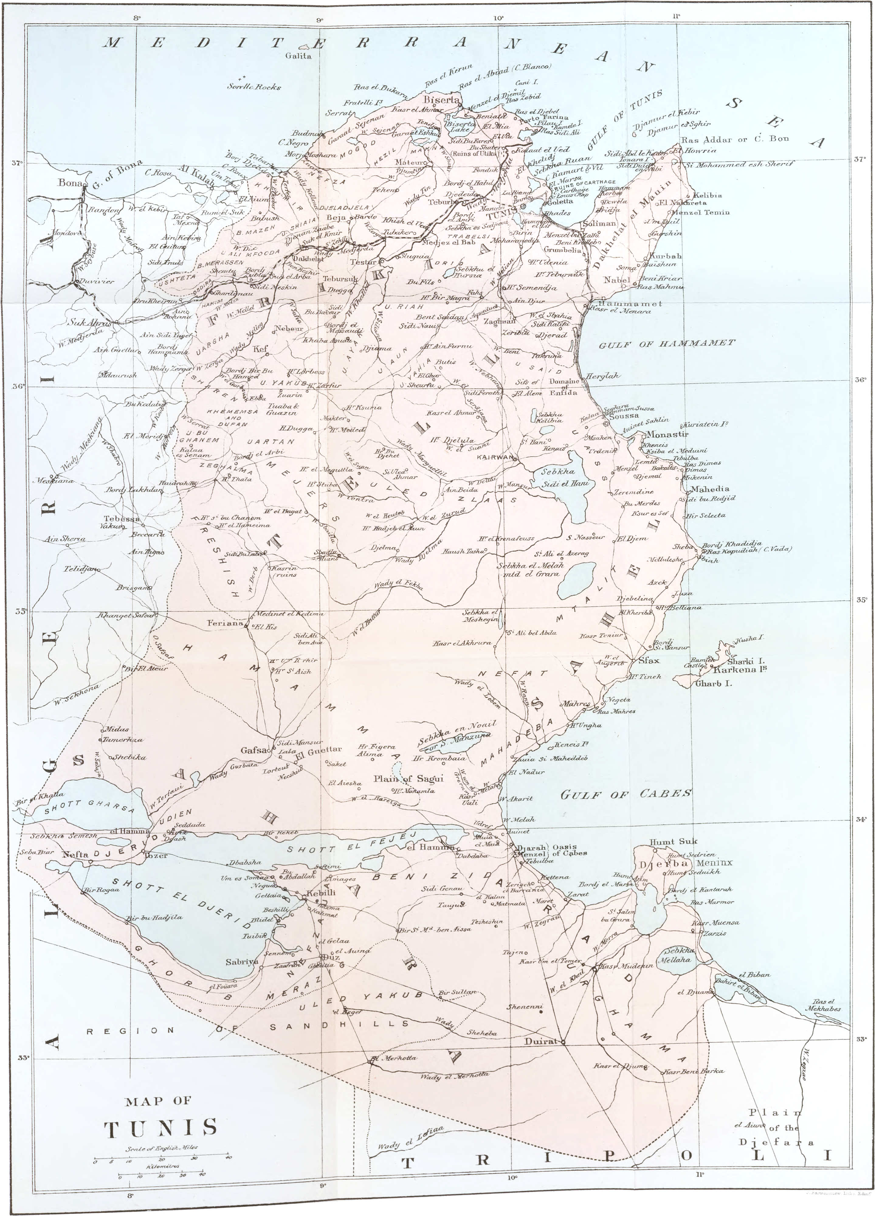 The coast-line of Northern Africa runs almost due east as far as Cape Bon, the Mercurii Promontorium of the Romans, at which point it takes an abrupt turn southwards till it reaches the island of Jerba, famous in history as the fabled abode of the lotus-eaters, and close to the lower extremity of the Gulf of Gabes, once known as the Lesser Syrtis. From this point the shore of the Mediterranean again resumes its easterly course towards Alexandria and the Nile.