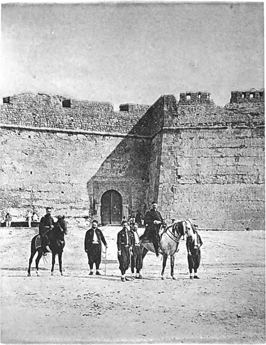 “On Saturday the 18th June I started by carriage to travel along the coast as far as Sfax[3] (‘the City of Cucumbers’). When between Susa and the Roman amphitheatre of El Djem I sat down under an olive-tree while my horses were resting. In a few minutes about thirty Arabs of the Mitelit tribe, accompanied by two Sheikhs, gathered round me. They first wanted to know to what nation I belonged, and when I told them, their spokesman answered that ‘Englishmen were friends of the Arabs,’ and began to talk unreservedly of their feelings and intentions. ‘We are all ready to fight against the French,’ he said, ‘though we know quite well they are more powerful than we are; but at any rate we shall die gloriously and enter Paradise!’ He added that a deputation from the Hamáma, Zlass, and Neffet tribes had already asked their (the Mitelits’) co-operation in case the French troops should enter Kairwán or interfere with that portion of the country. They said also that they had secured the cordial support of the Mourabats (Almoravides) at Kairwán, and would all take the field as soon as they fixed on a competent leader. One of the Sheikhs mentioned that Ali Ben Hlifa (Caid of Neffet) had already declared himself on the side of the Arabs, and that the Bey had sent a commission, or sengiak, to each clan, consisting of ten irregular soldiers under a sergeant-major, to ascertain their intentions. As the persons[4] forming these commissions undoubtedly sympathise with the Arabs, they will as a matter of course echo the hackneyed phrase that ‘tranquillity reigns everywhere,’ and conceal what is really going on, if they do not actually promote it.
