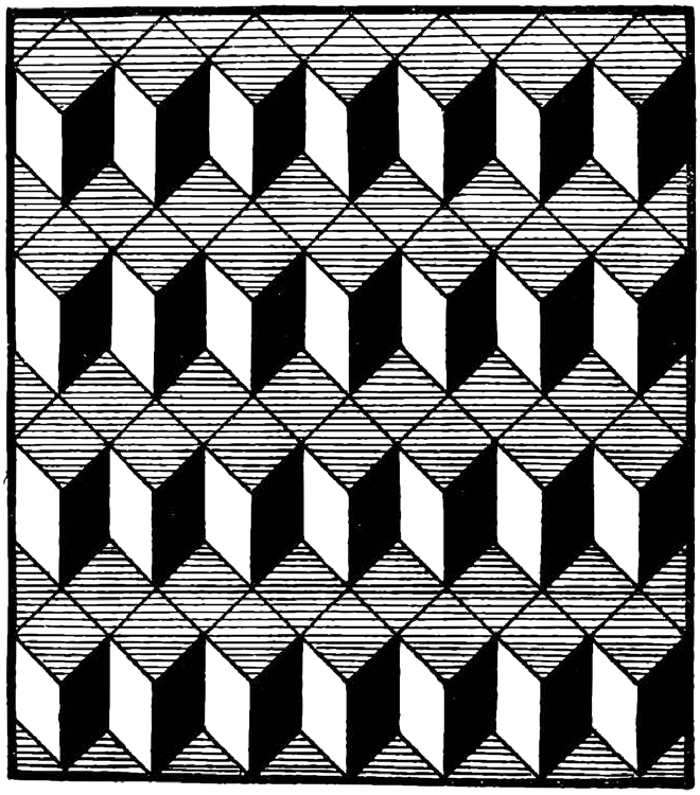 “You’ve seen those ‘illusion’ diagrams, for instance this one of a group of cubes. (Diagram is on opposite page.) Make up your mind that you are looking down upon their upper surfaces, and indeed they seem below you. Now change your mind, and imagine that you are down below, looking up. Behold, you see their lower surfaces; you are indeed below them. You have ‘gone somewhere,’ yet there has been no translation of anything. You have merely changed coordinates.”
