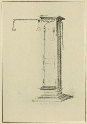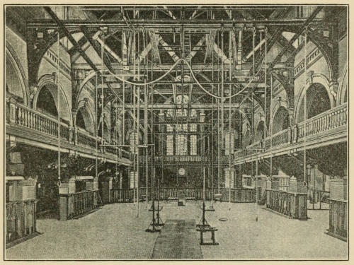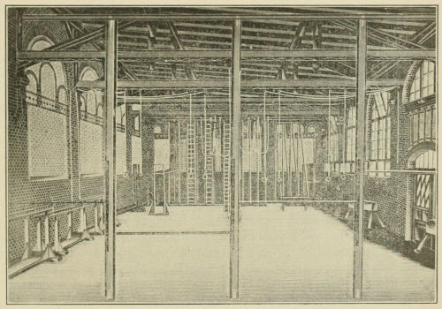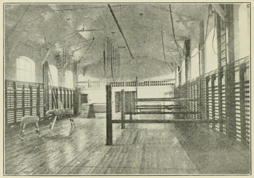 The men’s gymnasium, surrounded by an iron fence, was reached only from the upper story of one of the houses just mentioned, [340]connected with the grounds inside by a bridge on which turnstiles were placed, for registering attendance. The equipment, designed by Dr. Sargent of Harvard University, consisted of two sheds with twelve sets of chest-weights in each, including six high and six low pulleys, “two giant-strides, eight sets of horizontal bars, eight sets of parallel bars, six jumping-boxes, seven boxes for quoit-pitching and shot-throwing, two sets of jumping standards and ropes, two sets of sandbags and attachments, four vaulting poles, three shots, two heavy weights, twenty-four quoits, twenty pairs of dumb-bells, ten sets of hurdles, and two large frames, each 160 feet long, to which are attached the following apparatus: four balance-swings, eight breast-bars, four single swings, two double swings, five swinging-ropes, one rope ladder, one iron Jacob’s ladder, one perpendicular ladder, one inclined ladder, four pairs of flying rings, four single trapezes, one climbing-pole, two inclined poles, two perpendicular poles. Around the outside of the ground there is a running and bicycle track 15 feet wide and ⅕ mile long.” The men’s grounds were opened to the public on August 27, 1889, in charge of Superintendent John Graham, and the next season extended from April 1 to about the middle of December, an average of 447 men and boys a day entering for use of the apparatus during this period. In May of 1891 thirteen electric arc-lamps were added, and thereafter the gymnasium was kept open until 9.30 P.M. The total number of visitors this year was 169,219, and on the three days showing the largest attendance the turnstiles registered 1649 (May 3), 1480 (July 30), and 1572 (July 31) admissions.