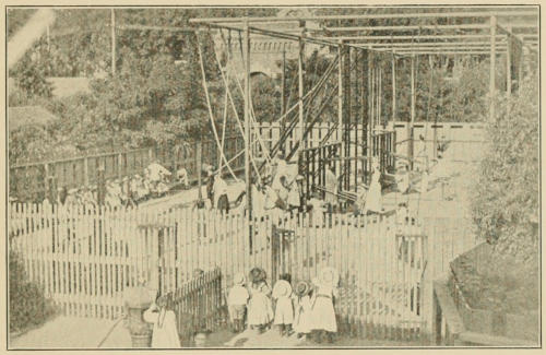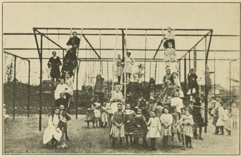 “The first school playground in Chicago,” according to Mrs. Zueblin, “was maintained in the Washington School’s yard in 1897 by the West End District of the Associated Charities. In the spring of 1898 an appropriation of $1000 was obtained from the City Council ($750 additional being later subscribed by individuals) for ‘temporary small parks,’ the administration of which was turned over to the Vacation School Committee of Women’s Clubs.” Miss Sadie American, chairman of that committee, writing of “The Movement for Small Playgrounds” in the American Journal of Sociology for September of 1898 (pp. 159-170) says that “the use of six schoolyards, basements, and one room to be used on hot and rainy days was asked of the board of education, and, being granted, the yards were equipped with swings, seesaws, sandbins, and cedar building-blocks. The Turnverein was greatly interested, and loaned portable apparatus for each school, such as parallel bars, horizontal bars, horse, ladders, etc., which were taken into the building at night. The playgrounds chosen were all in densely populated districts and among various nationalities.... For each there were engaged a kindergartner and a man who should be a ‘big brother to the boys,’ for the older boys were considered equally or more than the younger ones.... The men were inexperienced, but entered into the spirit of the work with enthusiasm, and from week to week rose in efficiency on the mistakes of the foregoing days.”