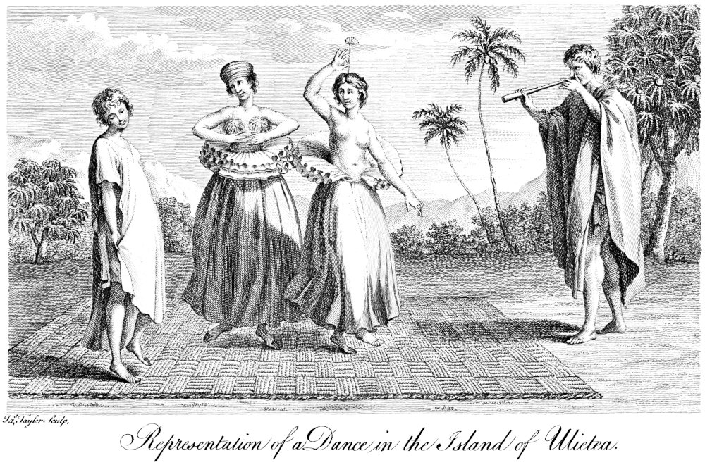On Wednesday, June the 12th, they sailed to another island, and as they coasted along it, the natives, armed as those of the other islands, kept even with the ship for some leagues. They frequently plunged into the sea, or fell on the sand, that the surf might break over them, to cool and refresh themselves. The boats being near the shore, the crew made signs that they were in want of water; on which the natives pointed farther along the shore, where, when the boats arrived, they saw a number of houses, and whither they were followed by the Indians, many more of whom joined them at this place. The boats having got close in shore, and the ships laying at a small distance, a venerable old man, with a white beard, advanced from the houses to the beach, attended by a young fellow. Having made a signal for the other Indians to retire, he came forward to the edge of the water, pressing his beard to his breast with one hand, and holding a branch of a tree in the other. He now made a kind of musical oration, during which the people in the boat threw him some trifling presents, which he would neither take up, nor permit his attendant to touch till he had finished his harangue, when he walked into the water, and throwing the branch to the boat’s crew, he retired, and picked 40up their presents. Most of the natives having complied with a sign made for them to lay down their arms, one of the Midshipmen swam ashore; on which they flocked round him, admiring his cloaths; as his waistcoat pleased them most he gave it to them, which he had no sooner done, than one of them untied his cravat and ran away with it. He now thought it time to retreat to the boat, whither several of the natives swam after him; some bringing each a cocoa-nut, and others fresh water in the nut-shell. The boat’s crew had taken with them some shells of the pearl oyster, in order to learn of the natives how to procure some pearls; but they could not possibly make them comprehend their meaning. This island is situated in 14 degrees 41 minutes south latitude, and 149 degrees 15 minutes west longitude; and both the islands the Commodore called King George’s Islands, in respect to his Sovereign. In a lake belonging to the last island, two or three very large vessels were seen, one of which had two masts, with proper cordage.