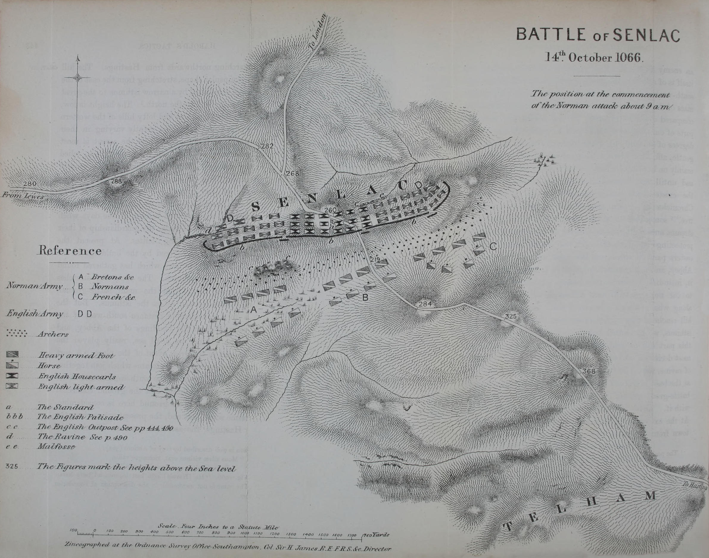 The appearance of this volume has been delayed for a considerable time in order to obtain for it a special advantage, namely an accurate military ground-plan of the battle-field of Senlac. For this my best thanks are owing to Colonel Sir Henry James, R.E. and to Captain Edward R. James, R.E. I had, on June 2nd, the great advantage of a final examination of the battle-ground in company with Captain James and Mr. Bryce. My account of the battle was then already printed, but I am glad to say that our examination led only to one or two small changes which I have made in the Additions and Corrections. Captain James has had the kindness to put my ideas of the battle, as drawn from the original writers, into scientific military shape. He is not responsible for my historical view of the battle, neither am I responsible for such purely vimilitary points as the extent and arrangement of the palisade. The relative position of the different divisions in the two armies seems beyond doubt, but the extent of ground occupied by each division must be matter of pure conjecture. The one absolutely certain point is the position of the English Standard and the fact that it was against that point that the main attack under William himself was made.