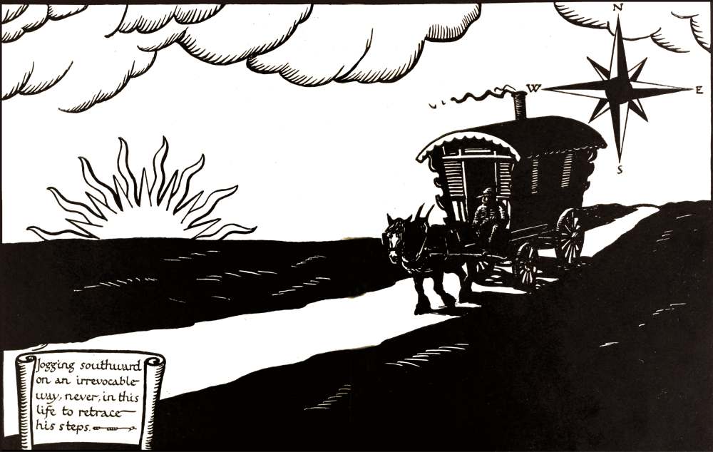 The dawn found him, with the shining eyes of one awakened to Life’s promise, jogging southward on an irrevocable way, never, in this life, to retrace his steps.
