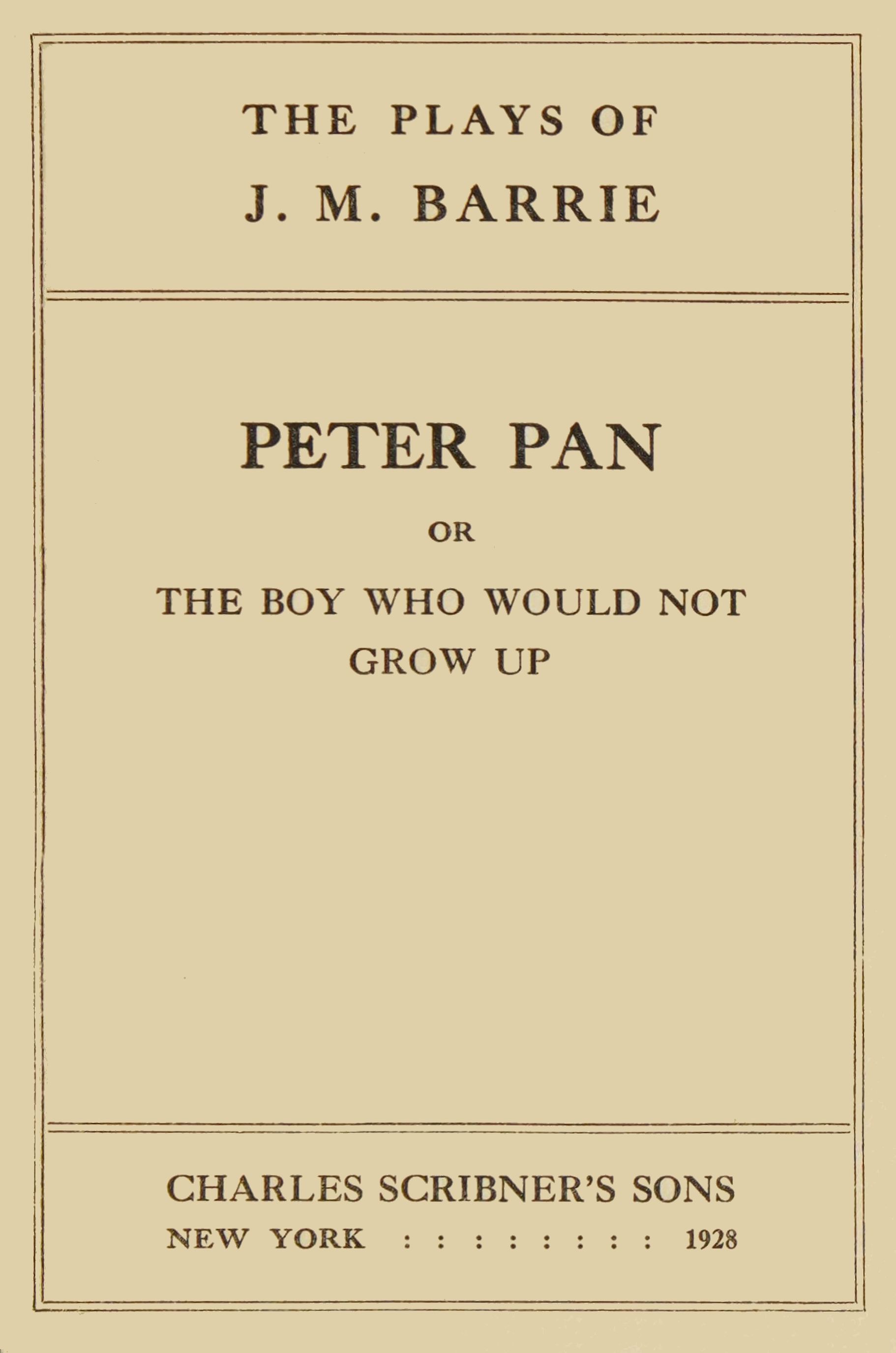 We had good sport of him before we clipped him small to make him fit the boards. Some of you were not born when the story began and yet were hefty figures before we saw that the game was up. Do you remember a garden at Burpham and the initiation there of No. 4 when he was six weeks old, and three of you grudged letting him in so young? Have you, No. 3, forgotten the white violets at the Cistercian abbey in which we cassocked our first fairies (all little friends of St. Benedict), or your cry to the Gods, ‘Do I just kill one pirate all the time?’ Do you remember Marooners’ Hut in the haunted groves of Waverley, and the St. Bernard dog in a tiger’s mask who so frequently attacked you, and the [Pg vii]literary record of that summer, The Boy Castaways, which is so much the best and the rarest of this author’s works? What was it that made us eventually give to the public in the thin form of a play that which had been woven for ourselves alone? Alas, I know what it was, I was losing my grip. One by one as you swung monkey-wise from branch to branch in the wood of make-believe you reached the tree of knowledge. Sometimes you swung back into the wood, as the unthinking may at a cross-road take a familiar path that no longer leads to home; or you perched ostentatiously on its boughs to please me, pretending that you still belonged; soon you knew it only as the vanished wood, for it vanishes if one needs to look for it. A time came when I saw that No. 1, the most gallant of you all, ceased to believe that he was ploughing woods incarnadine, and with an apologetic eye for me derided the lingering faith of No. 2; when even No. 3 questioned gloomily whether he did not really spend his nights in bed. There were still two who knew no better, but their day was dawning. In these circumstances, I suppose, [Pg viii]was begun the writing of the play of Peter. That was a quarter of a century ago, and I clutch my brows in vain to remember whether it was a last desperate throw to retain the five of you for a little longer, or merely a cold decision to turn you into bread and butter.