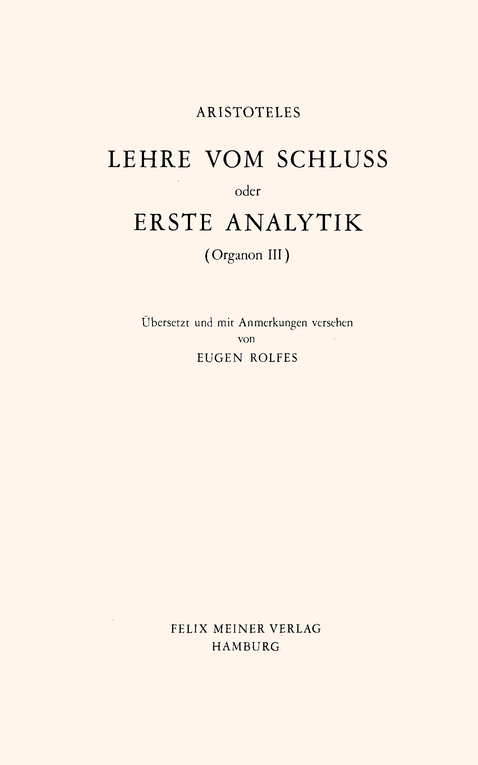 Die erste und die zweite Analytik unterscheiden sich voneinander, wie das auch die allgemeine Ansicht der scholastischen Kommentatoren war, im Grunde nur dadurch, daß die erste den beweisenden Schluß nach Seite der Form, die zweite ihn nach Seite des Inhaltes betrachtet; die erste lehrt, wie er aus den Prämissen schließen muß, um ein Schluß, die zweite, aus welchen Prämissen er schließen muß, um ein wissenschaftlicher [Pg v]Schluß und ein Beweis im strengen Sinne des Wortes zu sein.