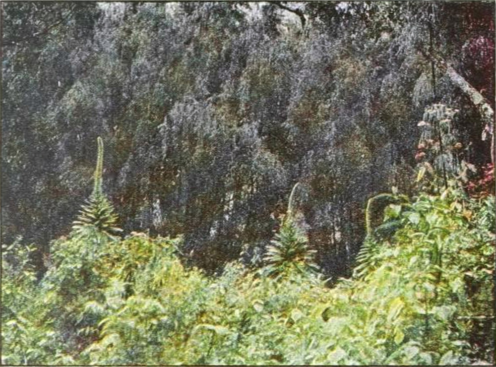 Titelbild. Lobelia Stuhlmanni in einer Urwaldlichtung (Elgon-Urwald).