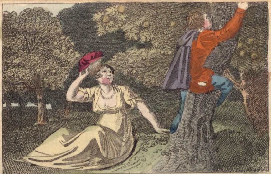 His wish was instantly accomplished, and they found themselves sitting under a large fig-tree; when the princess, seeing what fine figs were on it, entreated him to get her one to eat. Andolocia, who loved Agrippina very much, notwithstanding that she had used him [Pg 20]so unkindly, immediately threw his cap upon the ground, and began to climb the tree.