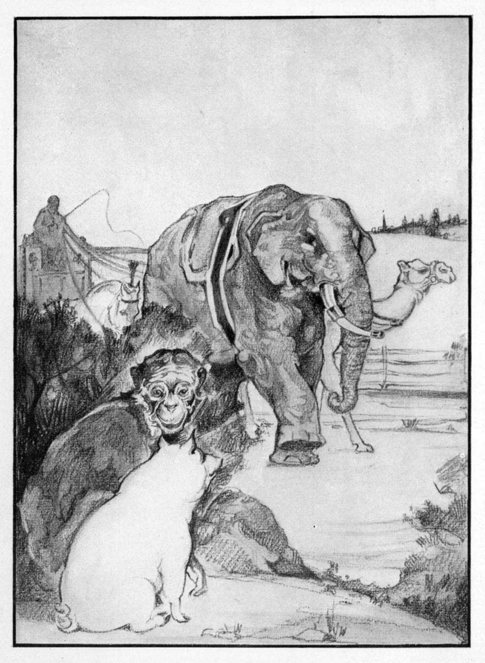The comical little pig and the merry monkey hid under the bush and ate acorns as they watched the circus procession go past. It was not a regular parade, as the show was going only from one town to-another. Squinty looked at the beautiful wagons, and at the strange animals, some with big humps on their backs. At last he saw some very big creatures, and he cried out: