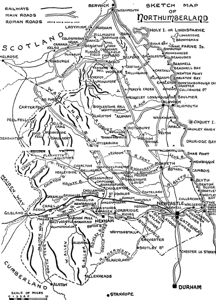 Northumbrians have always been interested in the records of their own county, and are now-a-days not less so than when, some three-and-a-half centuries ago, Roger North found them “great antiquarians within their own bounds.” If to such as these this little book may perhaps bring in a more convenient form the information they seek, and help them to become better acquainted with the county which inspired Swinburne to write in stirring phrases of “Northumberland,” and to address the home of his people as
