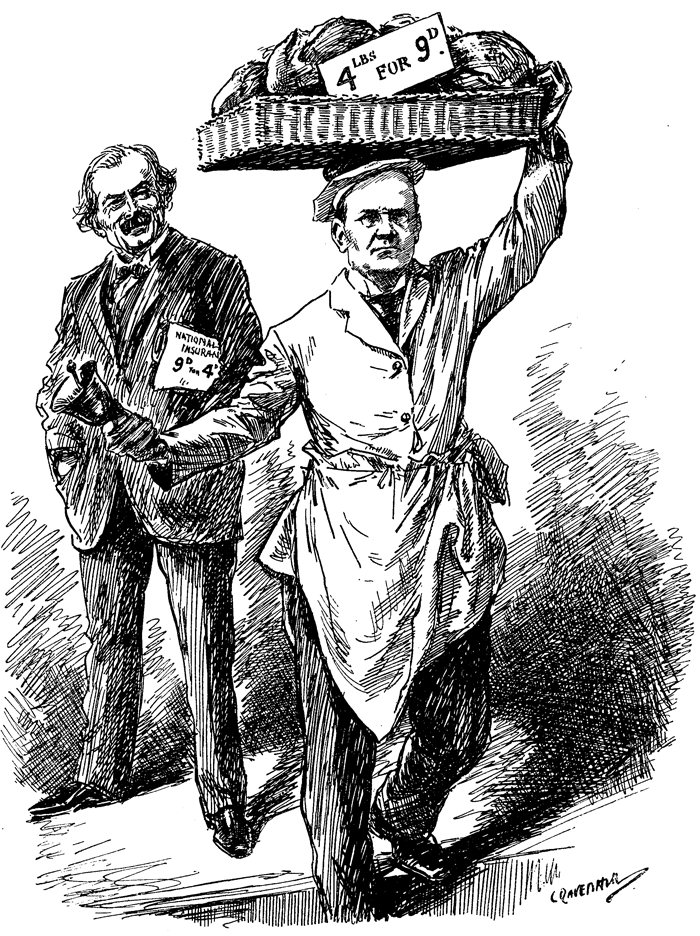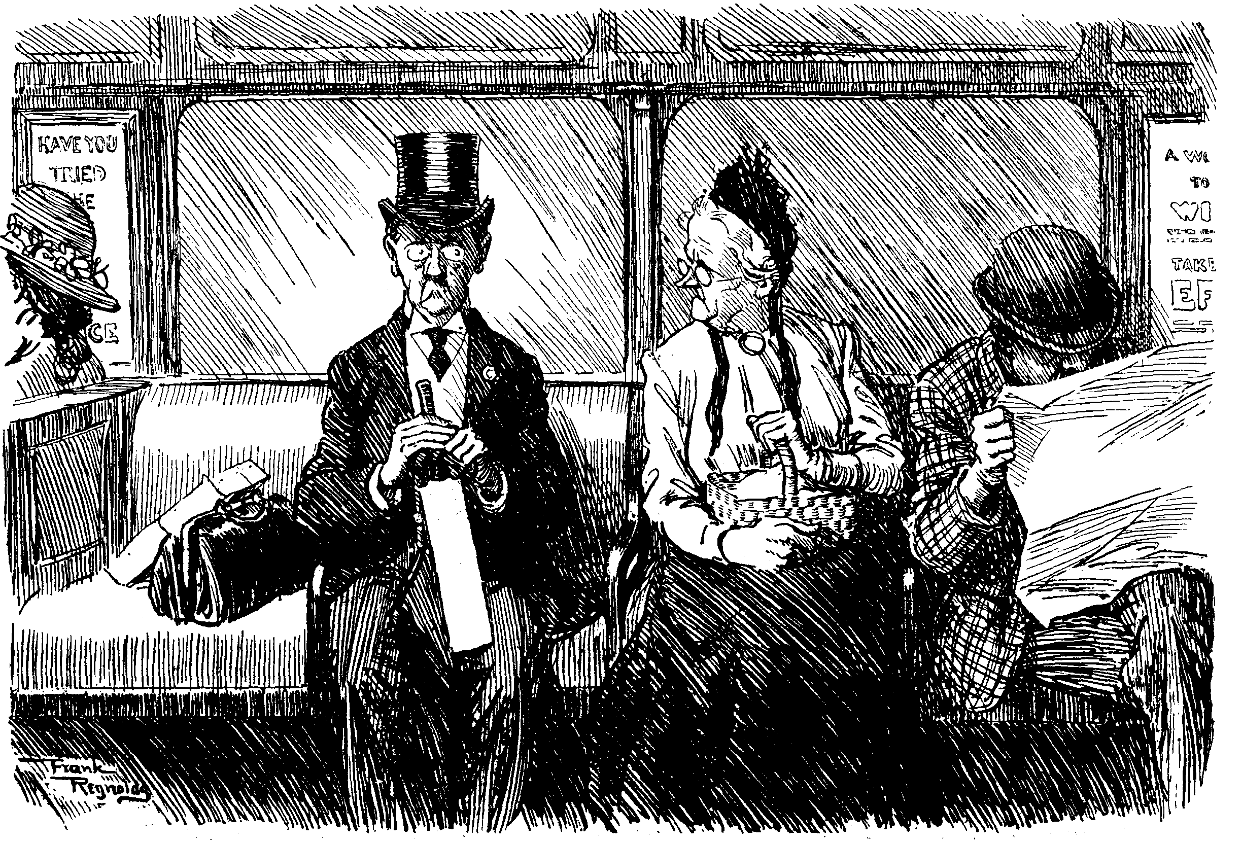 At Waterton and Paddingloo great crowds continued to board the limited number of West-bound and South-west-bound trains. On being asked why they were leaving town, those of the travellers who answered at all said it was the regular time for their annual holiday and they wanted a change. They were mostly a jolly hearty lot, happily confident that at some time in the course of the next forty-eight hours they would be deposited in some part of the West or South-west of England. Those fortunate persons who had secured seats were sitting down, those who were unable to get seats were standing, and, in spite of the congested state of the carriages and corridors, almost all were smiling, the exceptions being those highly-strung and excitable passengers who had come to blows over corner seats and windows up or down. Many of the travellers carried baskets of food. Your representative, anxious to report on the quality and quantity of the provisions carried, ventured to peep into one of the baskets, and was in consequence involved in a rather unpleasant affair, being actually accused of having abstracted a sandwich!