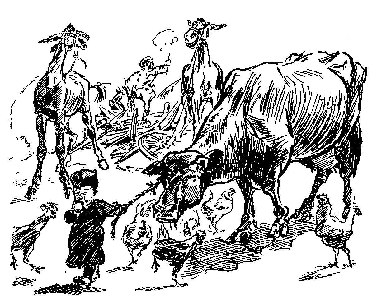 When the Heatherdale Hussars received a two-hours' notice to "trek" they, of course, dumped their mascot, Hyldebrand, a six-months-old wild boar, at the Town Major's. They would have done the same with a baby or a full-grown hippopotamus. The harassed T.M. discovered Hyldebrand in the next stable to his slightly hysterical horse the morning after the H.H. had evacuated, and informed me (his village Sanitary Inspector) that "as I was fond of animals" (he had seen me distributing fly-traps and painting horse-trough notice-boards) I was henceforth in sole command of Hyldebrand until such time as his owners should reclaim him. A grant of five sous per diem had been left for the piglette's maintenance.