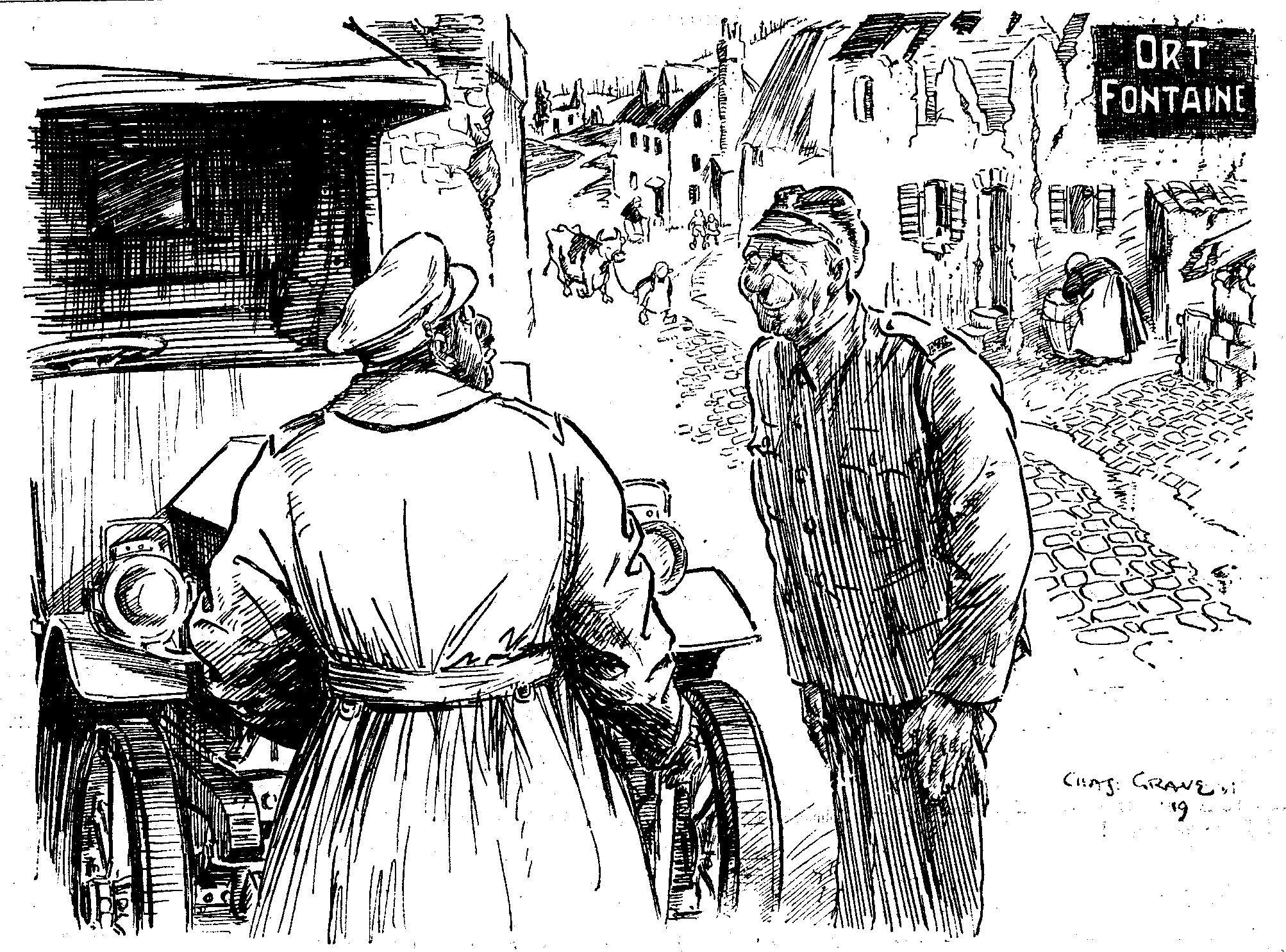 Chardenal and I had picked up the best thing we could find, brass cartridge cases (about three feet high) of a 5·9 gun, and some shorter eight-inch affairs. It was hard work. I carried four of the former and Chardenal carried two of each, and we looked as if we had come to mend a main drain. Not having been in the Army long enough to have lost all sense of shame, Chardenal began by trying to hide his cases under his British warm. His biggest effort at concealment was made when passing the sentry of the Brigade Headquarters' guard, and the noise he made doing it brought the whole guard out. However, being sentries, they took very little notice of what we did, except that the N.C.O. in charge certainly did pick up one of the dropped cases and hand it to Chardenal. This was after I had tried to help him and we had dropped the whole lot.