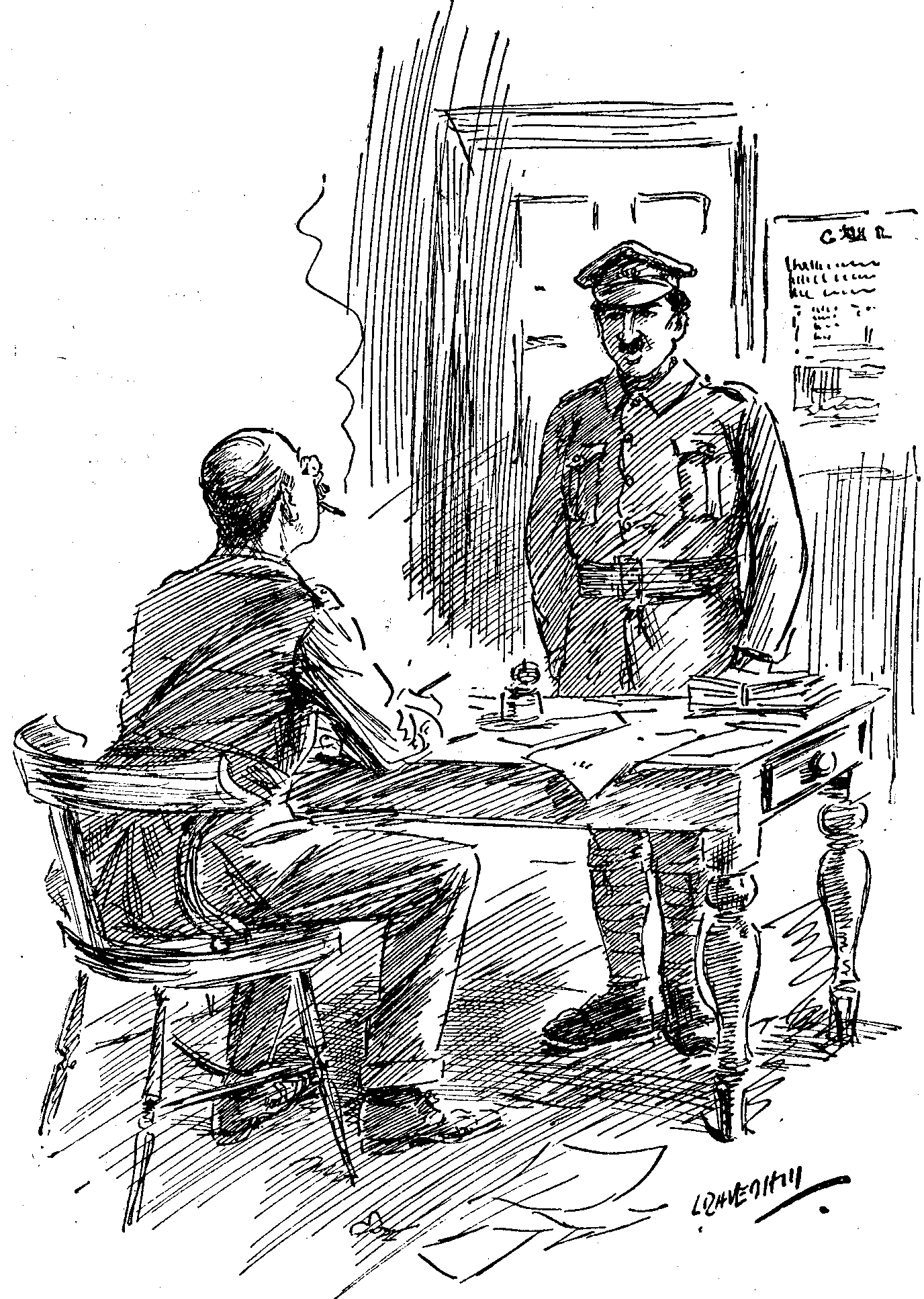 was struggling painfully to insert a pair of boots into a recalcitrant kit-bag, and exhibited an expression of dogged determination rather than the astonishment he had predicted. The Trimmer was heard complaining mournfully that when he left the Patrol Office for the last time they never said good-bye. He seemed to feel this keenly.