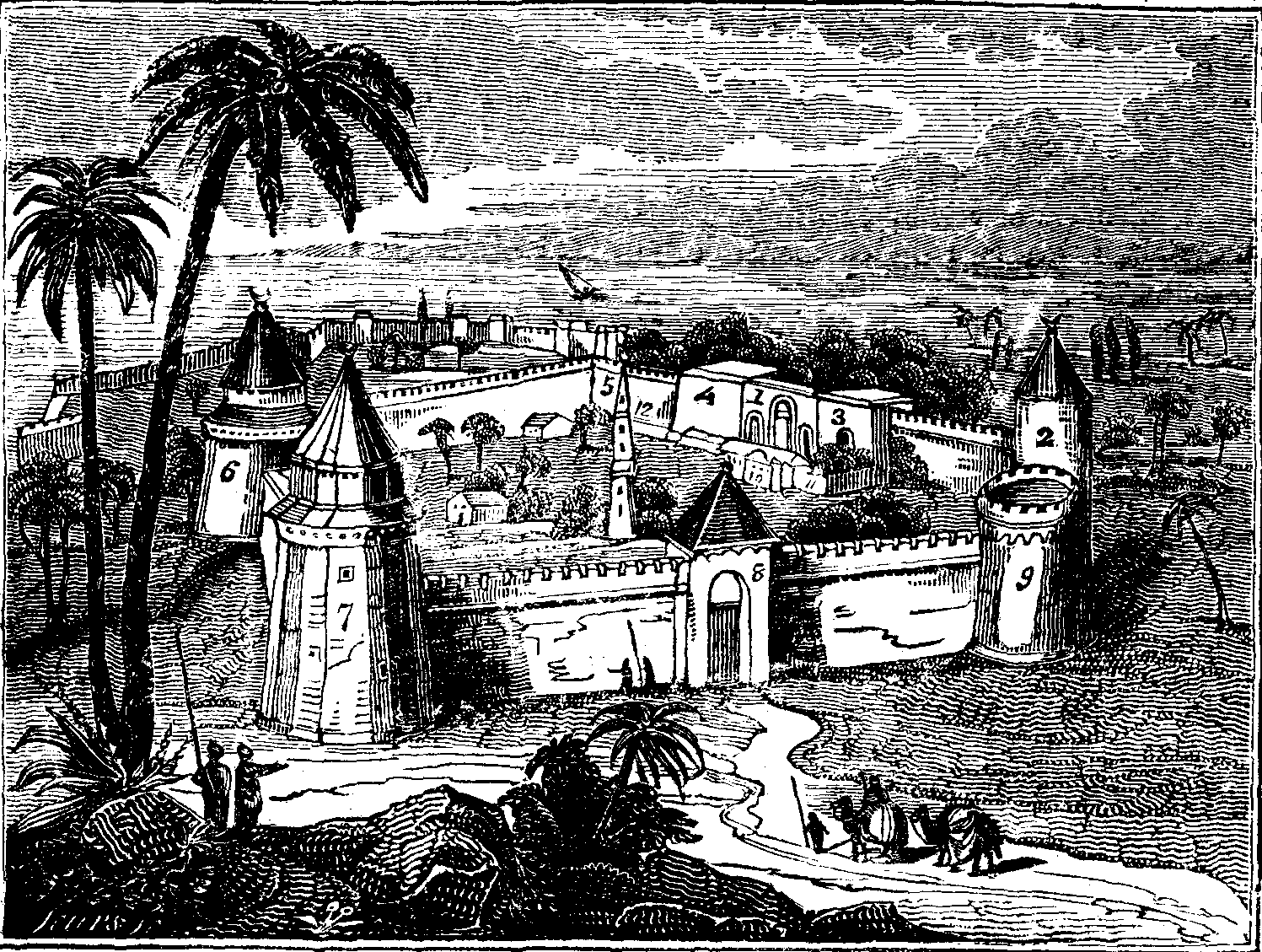 Our engraving, aided by the subjoined references, will, however, enable our readers to form an accurate idea of the topography of the Seven Towers. It is copied from the Travels of M. Ponqueville, who devotes a chapter of his quarto volume to a minute description of towers, gardens, and fortresses. Nothing can exceed the horror with which his catalogue of their miseries is calculated to impress the reader; indeed, they fall but little short of some of the highly-wrought fictions of barbarous romance.