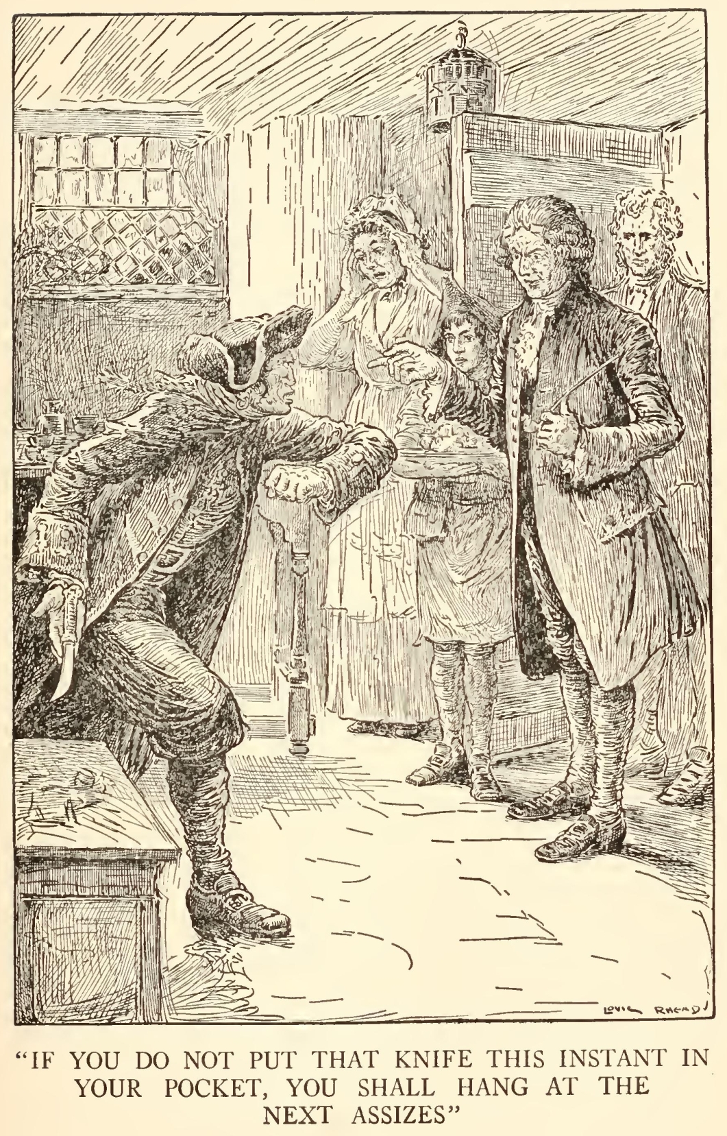 “Well,” said he, “my mate Bill would be called the captain, as like as not. He has a cut on one cheek and a mighty pleasant way with him, particularly in drink, has my mate Bill. We’ll put it, for argument like, that your captain has a cut on one cheek—and we’ll put it, if you like, that that cheek’s the right one. Ah, well! I told you. Now, is my mate Bill in this here house?”