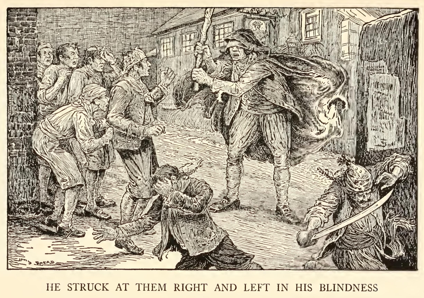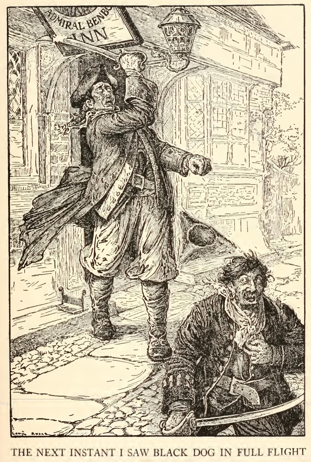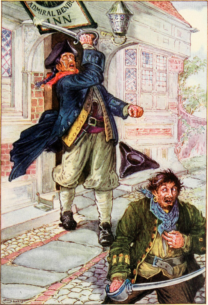 Then all of a sudden there was a tremendous explosion of oaths and other noises—the chair and table went over in a lump, a clash of steel followed, and then a cry of pain, and the next instant I saw Black Dog in full flight, and the captain hotly pursuing, both with drawn cutlasses, and the former streaming blood from the left shoulder. Just at the door the captain aimed at the fugitive one last tremendous cut, which would certainly have split him to the chine had it not been intercepted by our big signboard of Admiral Benbow. You may see the notch on the lower side of the frame to this day.