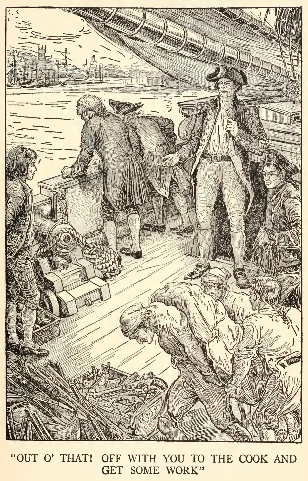 We were so short of men that everyone on board had to bear a hand—only the captain lying on a mattress in the stern and giving his orders, for though greatly recovered he was still in want of quiet. We laid her head for the nearest port in Spanish America, for we could not risk the voyage home without fresh hands; and as it was, what with baffling winds and a couple of fresh gales, we were all worn out before we reached it.
