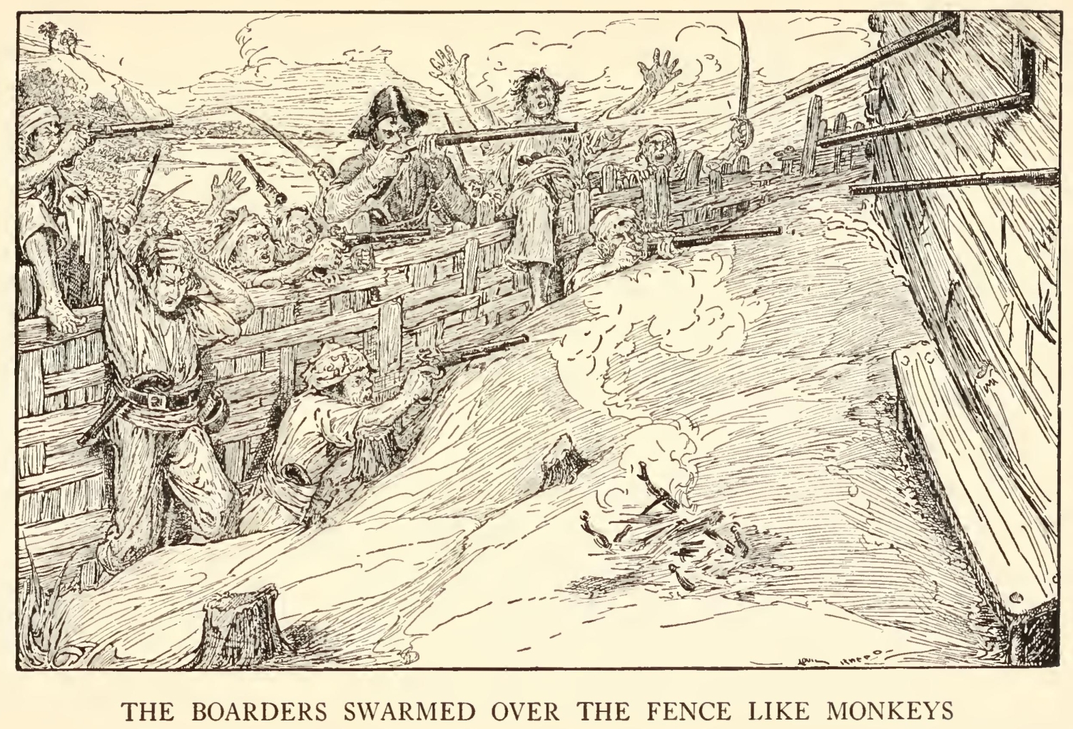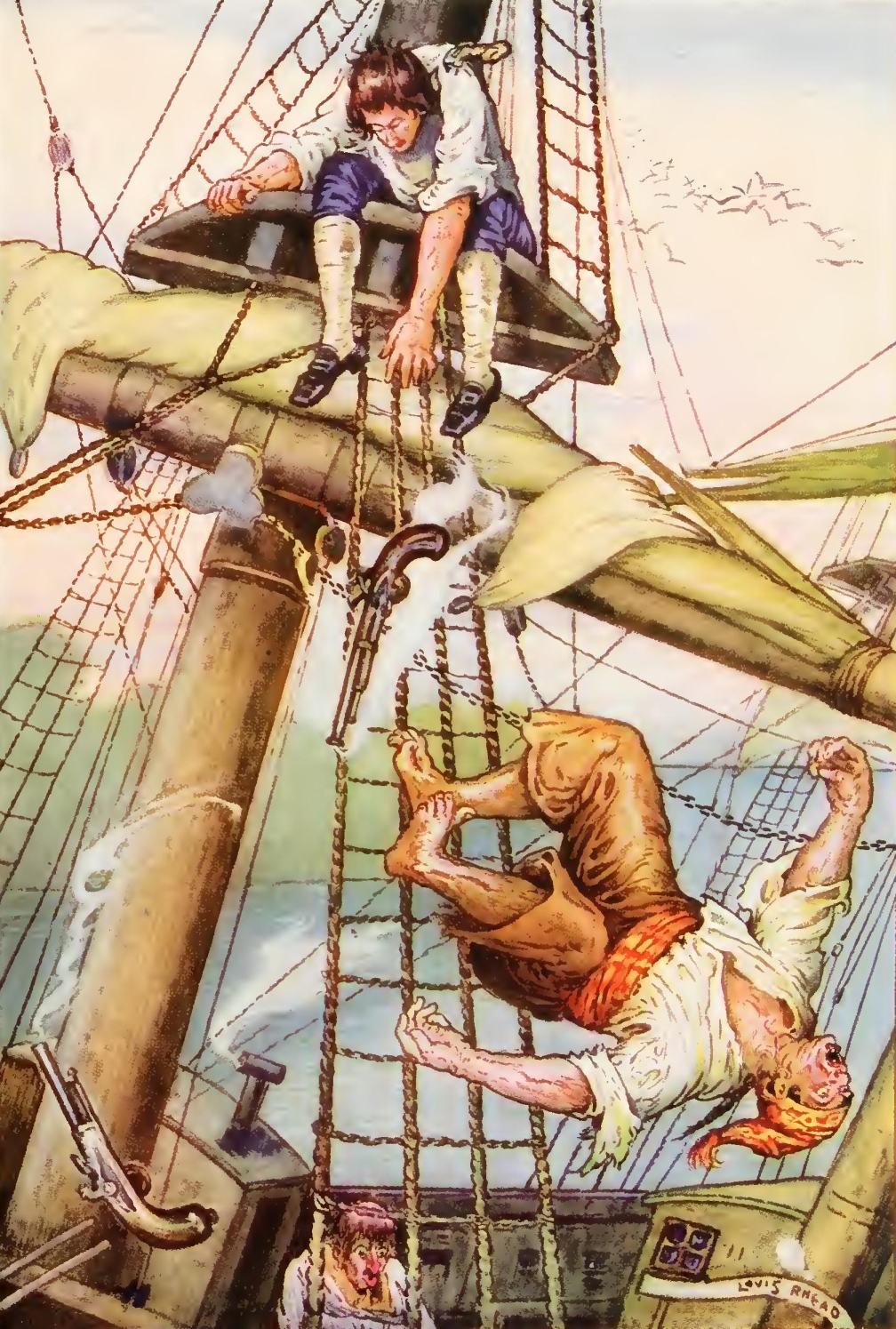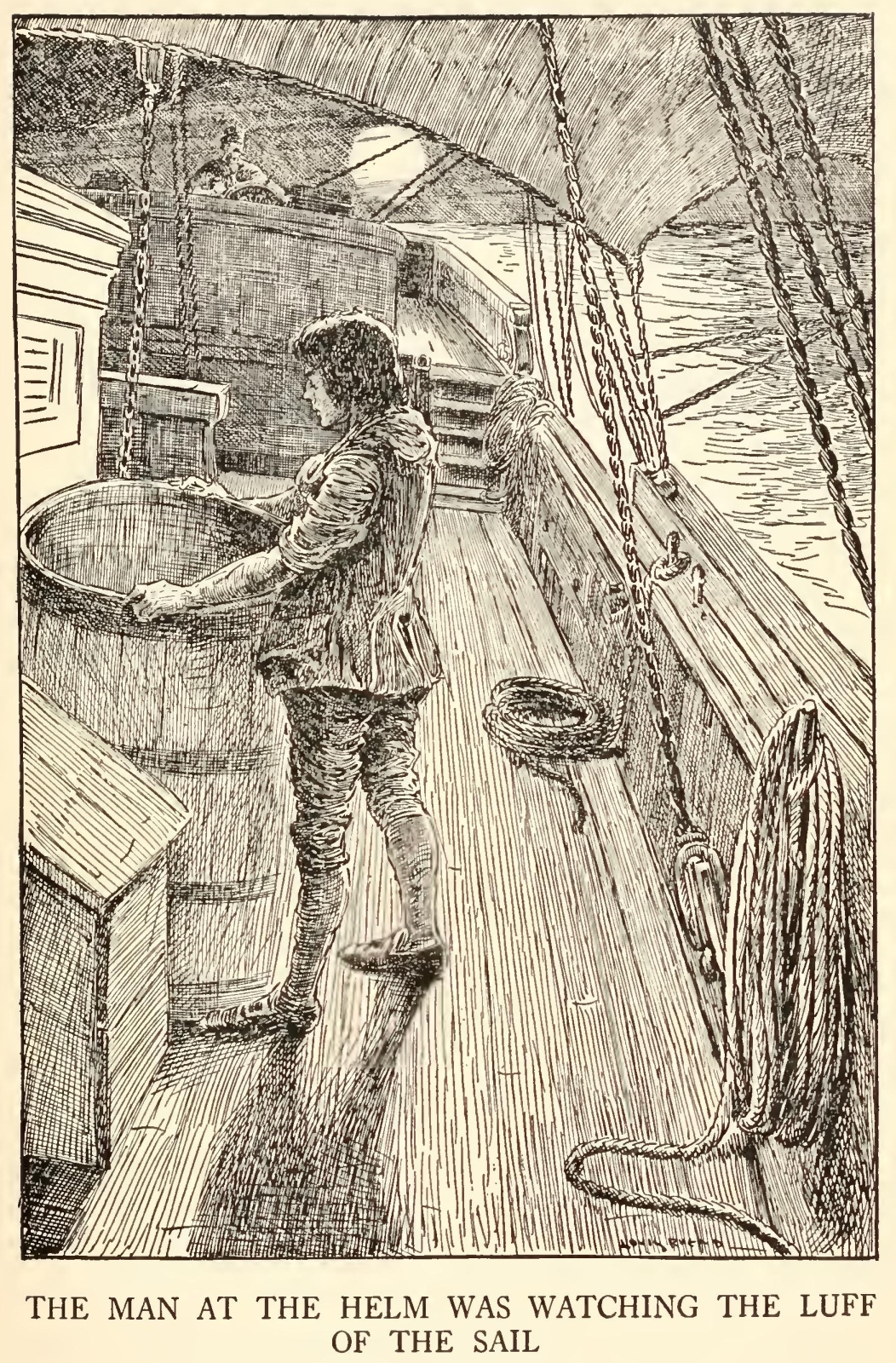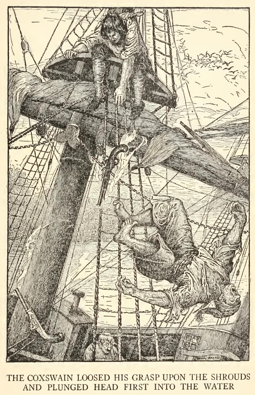 At last, seeing the ship still bore on her course and was now swiftly drawing out of earshot, one of them—I know not which it was—leapt to his feet with a hoarse cry, whipped his musket to his shoulder, and sent a shot whistling over Silver’s head and through the main-sail.
