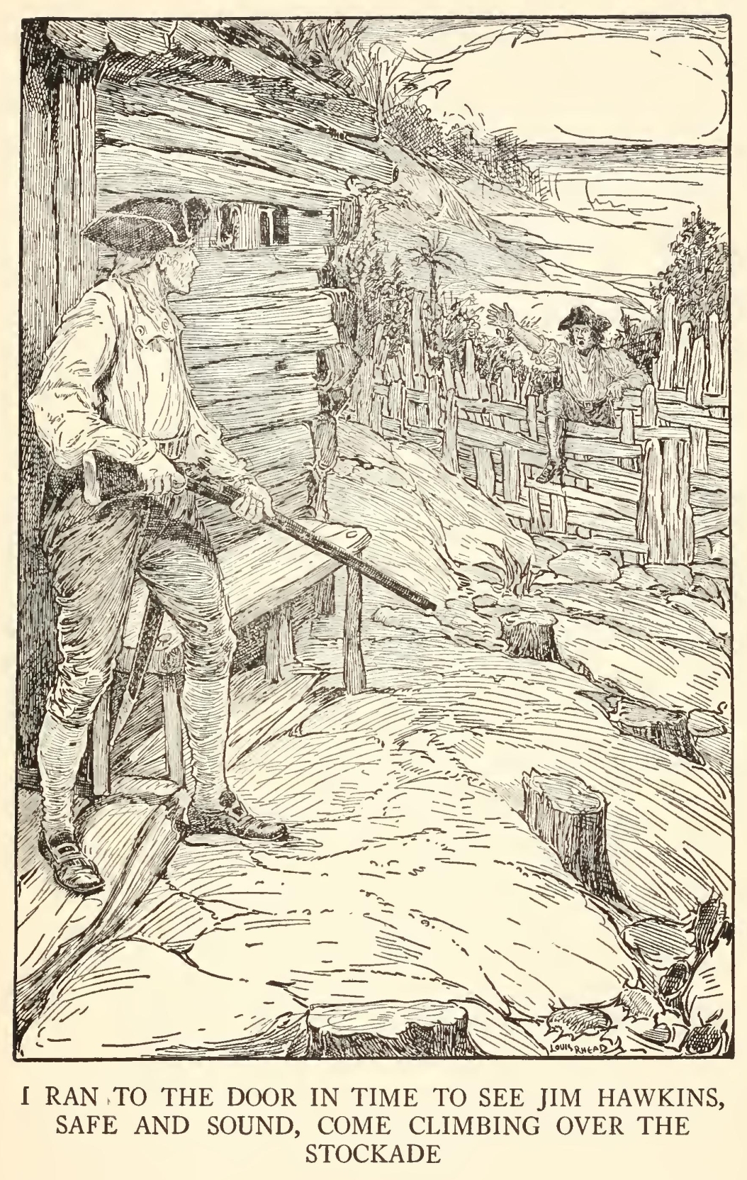At the same moment, the doctor, Gray, and Ben Gunn joined us, with smoking muskets, from among the nutmeg-trees.
