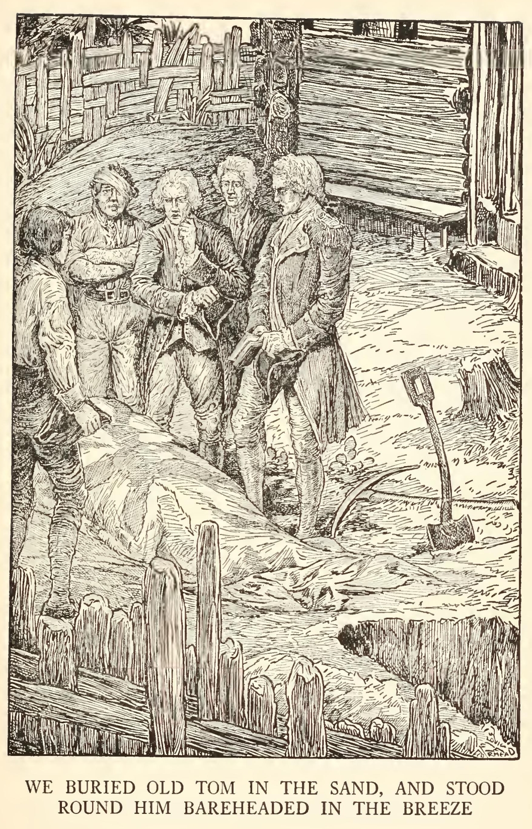 The three fellows must have been watching us closer than we thought for, as we soon had proved. For coming through the narrows, we had to lie very near the southern point, and there we saw all three of them kneeling together on a spit of sand, with their arms raised in supplication. It went to all our hearts, I think, to leave them in that wretched state; but we could not risk another mutiny; and to take them home for the gibbet would have been a cruel sort of kindness. The doctor hailed them and told them of the stores we had left, and where they were to find them. But they continued to call us by name and appeal to us, for God’s sake, to be merciful and not leave them to die in such a place.