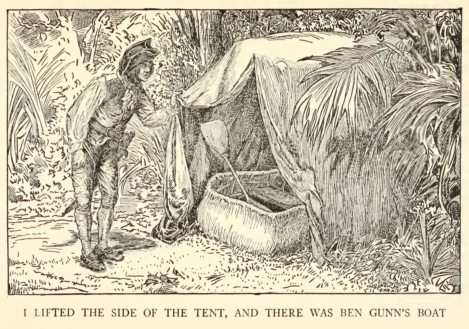 Ben Gunn was on deck alone, and as soon as we came on board he began, with wonderful contortions, to make us a confession. Silver was gone. The maroon had connived at his escape in a shore boat some hours ago, and he now assured us he had only done so to preserve our lives, which would certainly have been forfeit if “that man with the one leg had stayed aboard.” But this was not all. The sea-cook had not gone empty-handed. He had cut through a bulkhead unobserved and had removed one of the sacks of coin, worth perhaps three or four hundred guineas, to help him on his further wanderings.